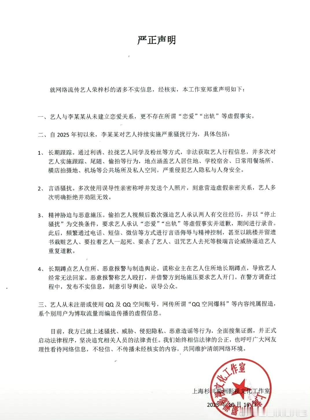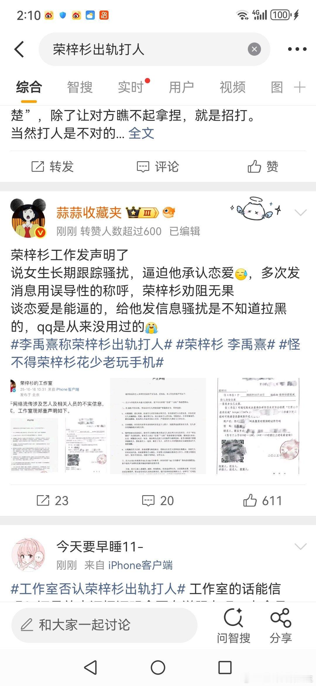 爆荣梓杉出轨打人荣梓杉工作室发声了,原因是被打女生长期跟踪骚扰,逼迫他承认恋情[流汗]而且多次发消息用误导性的称呼,荣梓杉劝阻无果