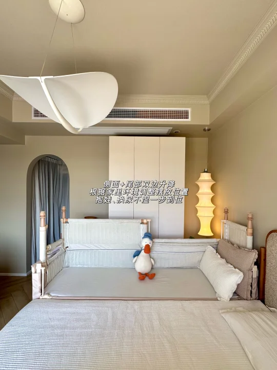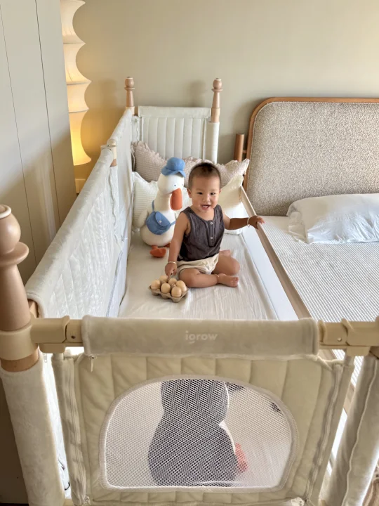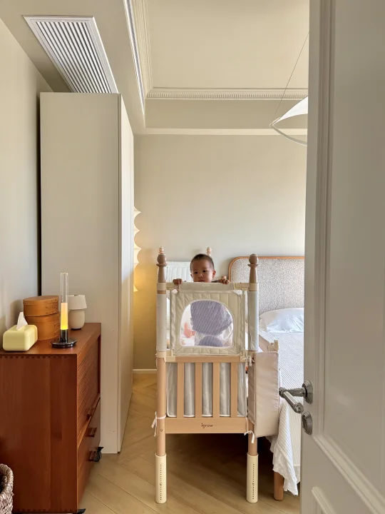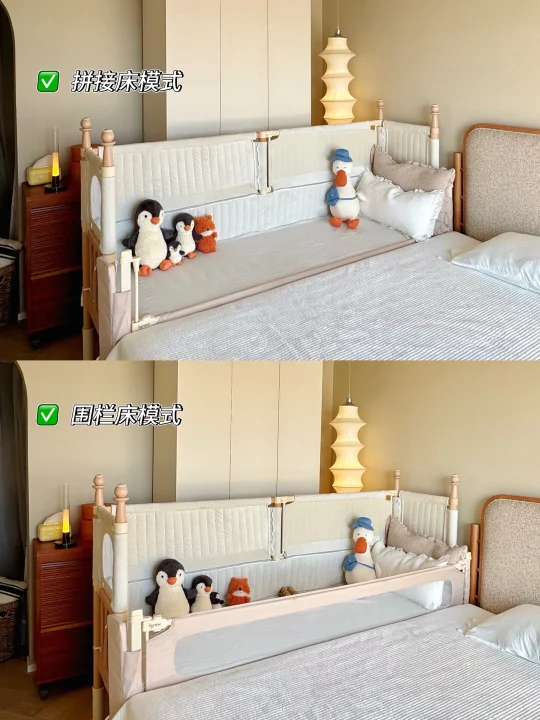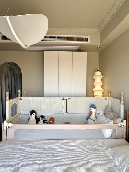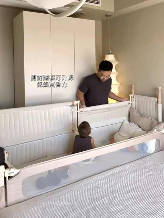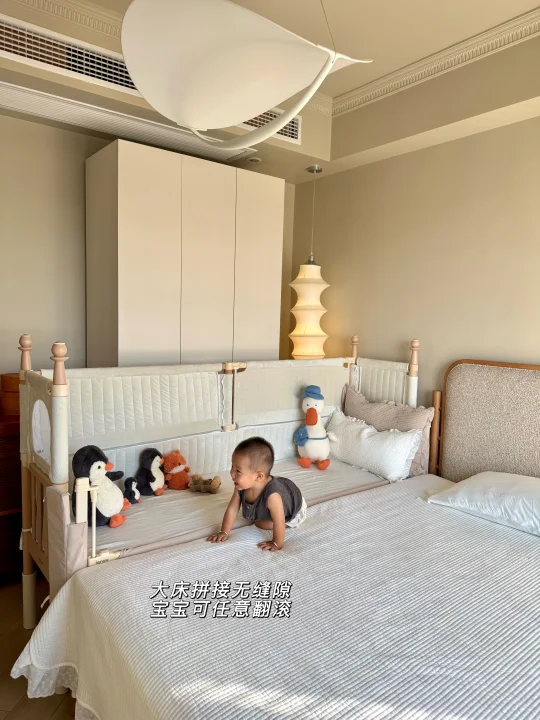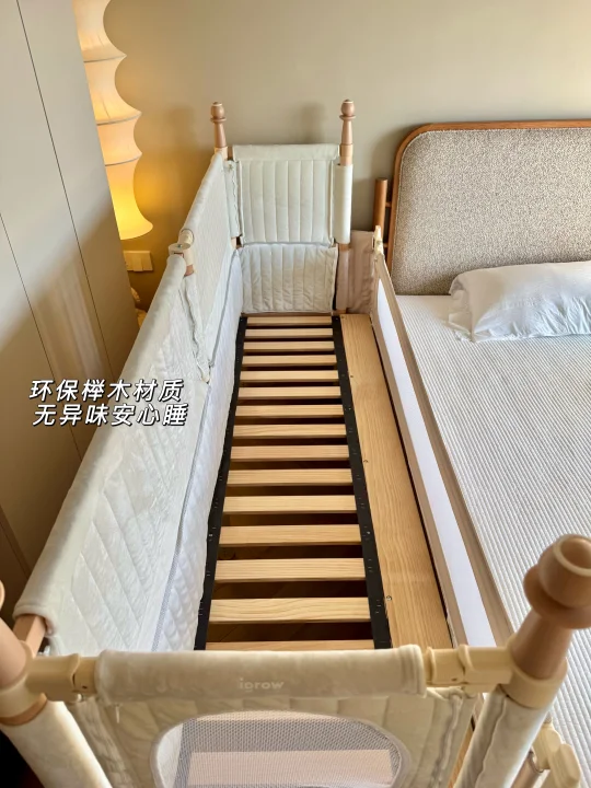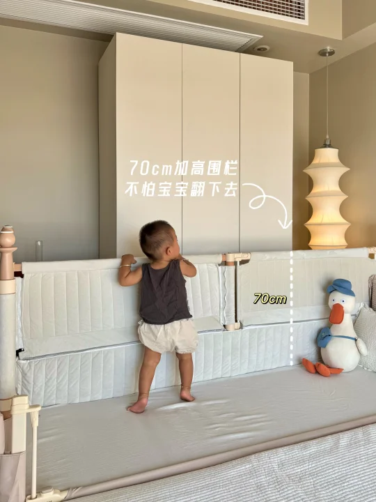最惊喜的是选配的可升降第四面小围栏,拉上它就变成独立小床,加上三面70cm的高防护软包围栏,变身孩子的安全堡垒,我偶尔去厨房热奶,留他在床里玩都踏实,终于解放了我的时间。这面小围栏还能培养娃的独立睡眠习惯,分床不分房,从婴儿期用到学龄前,性价比直接拉满。