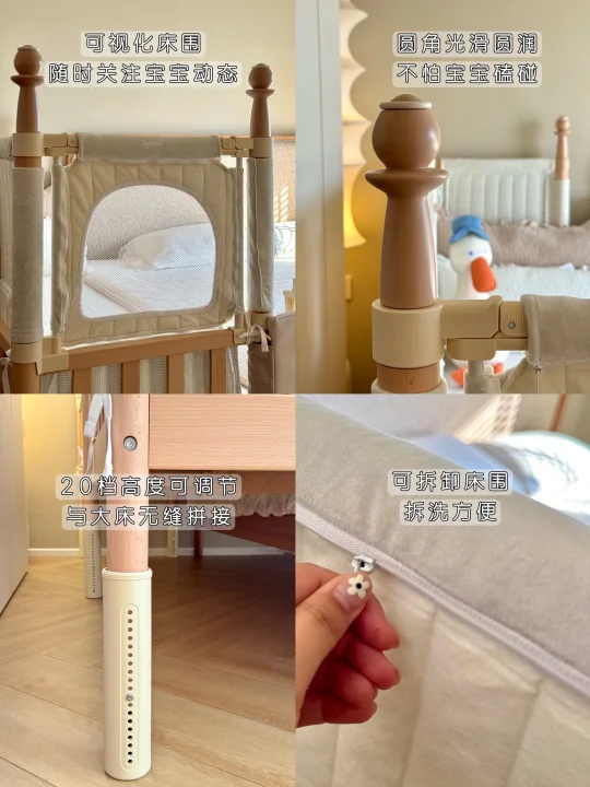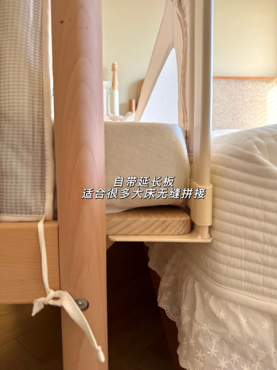 它的无缝拼接让妈妈安心,10cm延长板加上20档可调节床腿,我家的高箱床也能贴得严丝合缝,宝宝在上面翻来翻去,再也不用半夜盯着床缝揪心想。