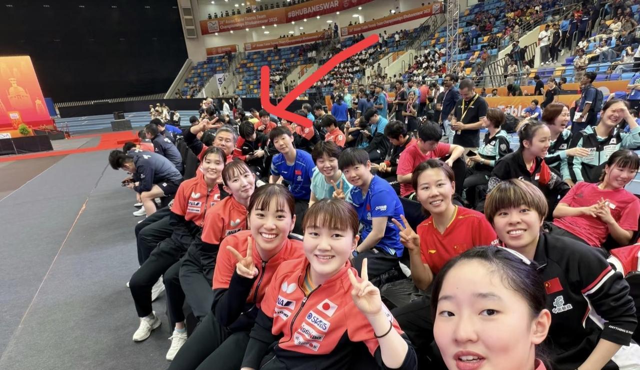 终于看到清晰版的了, 这张图里真有大头, 网友们真是火眼金睛, 大头坐在曼昱的旁边, 正低头玩手机呢? 哈哈, 这个时候他应该也只敢坐在曼昱旁边吧, 要是换成莎莎, 那好多人要疯了, 话说回来, 在印度打比赛, 跟在国内差别也太大了, 观众席上只有稀稀落落的几个人, 大家都害怕去印度呀!