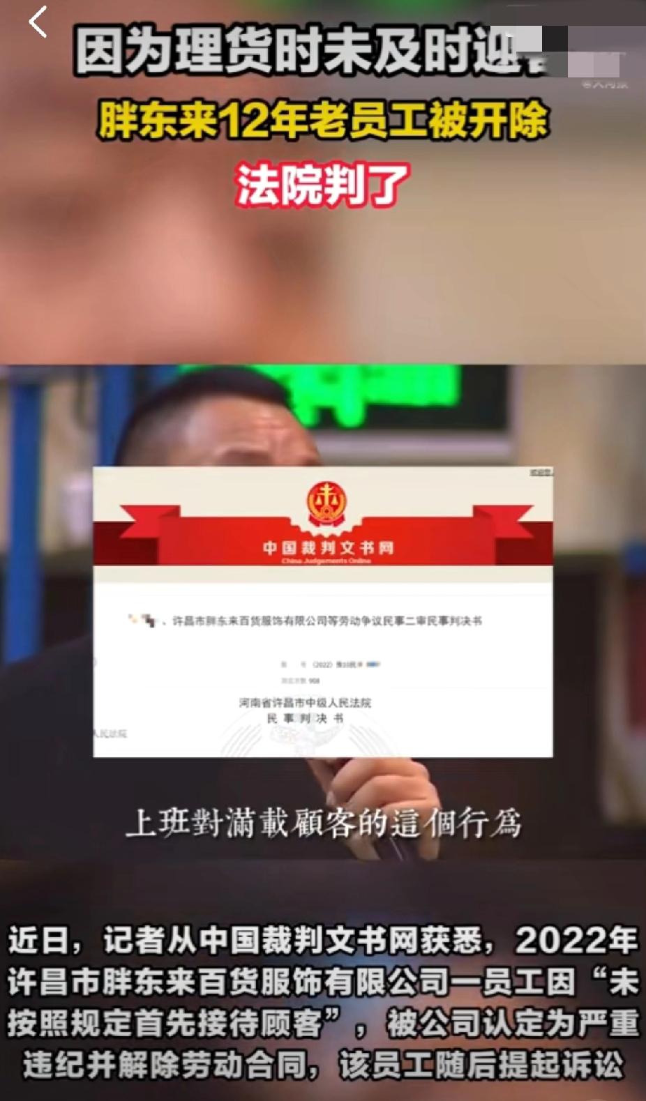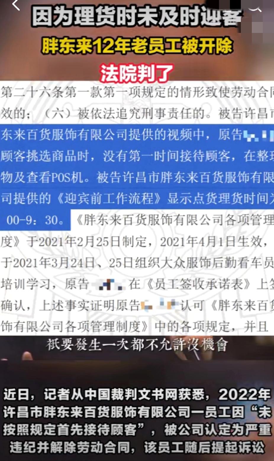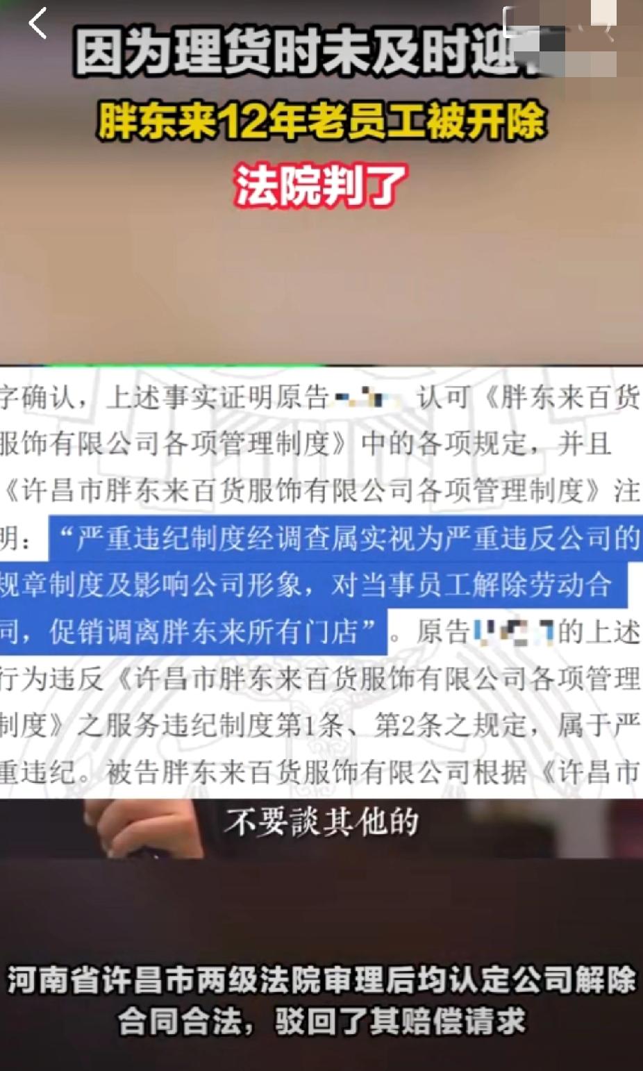 惊了!胖东来12年老员工因没及时迎客被开除?法院还判公司赢了! 家人们谁懂啊!打了12年工的老员工,就因为整理货物时没第一时间接待顾客,直接被胖东来开除了!更让人意外的是,员工起诉后,两级法院都认定公司解除合同合法,驳回了赔偿请求 。这波操作直接把网友分成了两大派,吵翻了天! 支持公司的人说:“胖东来薪水比同行高不少,高待遇配高要求没毛病,签字认了制度就得遵守”。质疑的人更气愤:“12年的青春和付出,抵不过一次小小的疏忽?也太冷血了吧”!毕竟这位员工当时是在认真理货,又不是偷懒摸鱼,换成谁遇到这种两难场景,可能都反应不过来。 要知道胖东来可是出了名的“人性化企业”,员工有40天年假还能拿“委屈奖”,怎么到这儿就变得这么“铁面无私”了?其实这事儿也给打工人提了个醒:入职时签的规章制度别当摆设,一定要看清楚,不然可能踩坑吃大亏 ! 不过话说回来,制度和人情就不能兼顾吗?给个警告或者扣点奖金的处罚不行吗?作为打工人,你遇到过类似的严格制度吗?要是你是老板,会怎么处理这件事?赶紧在评论区聊聊你的看法! 胖东来12年老员工被开除 职场那些事