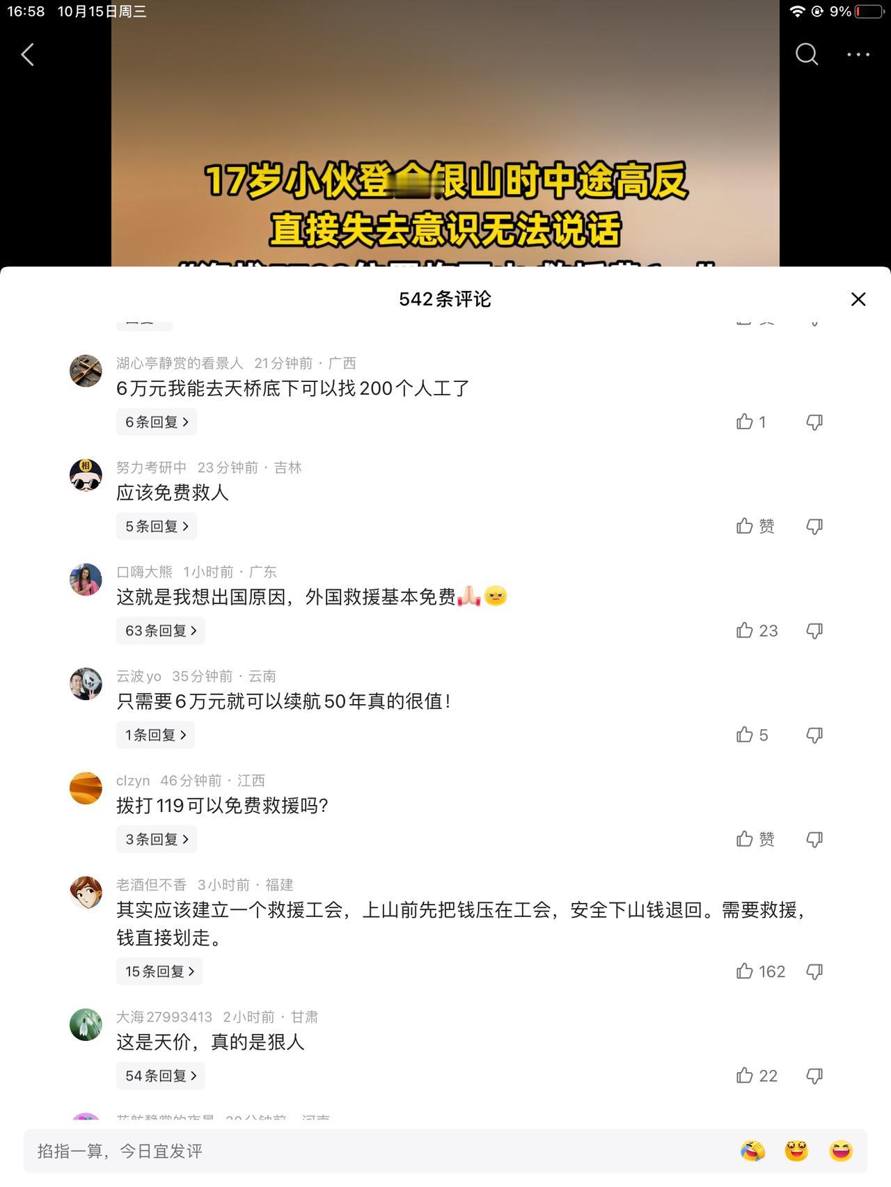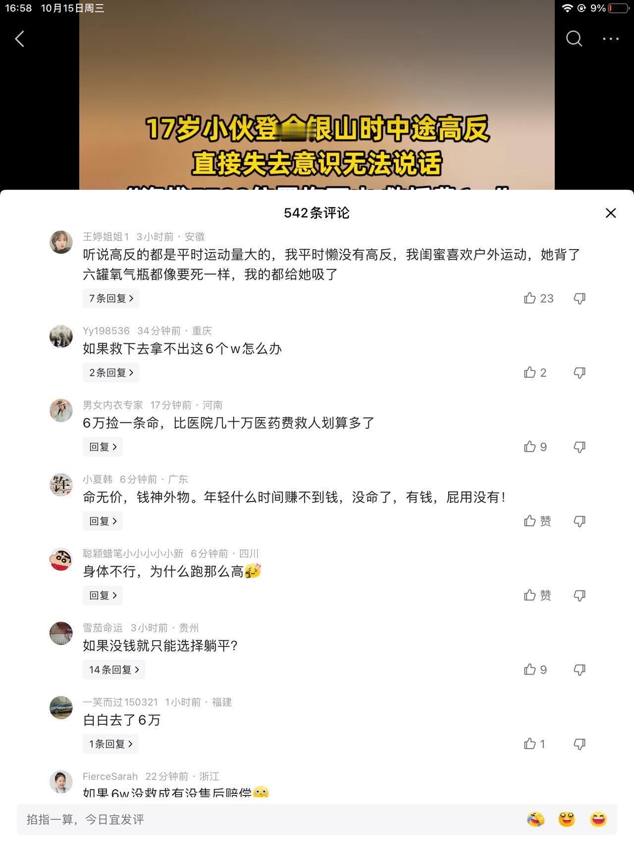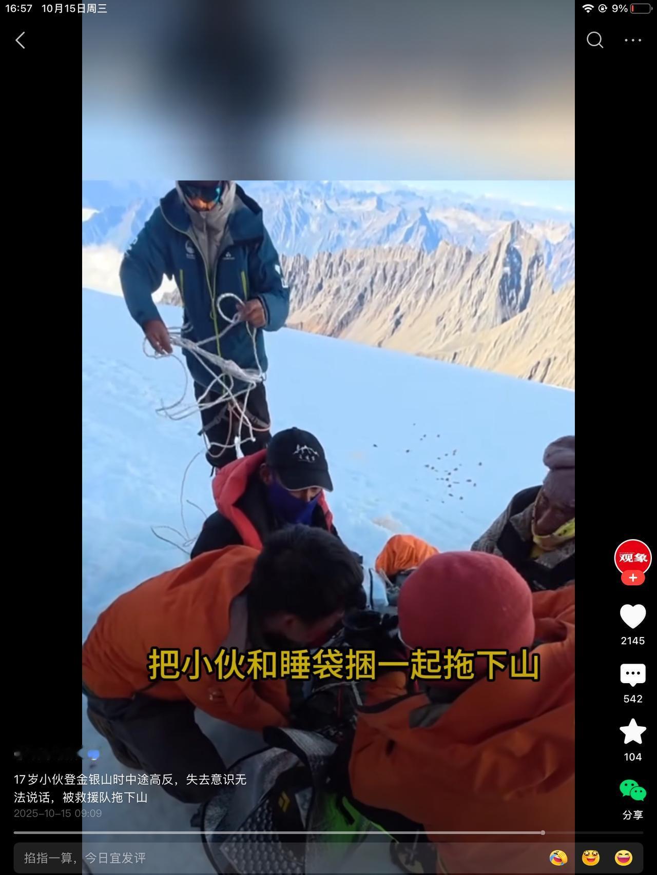 17岁小伙登山途中高反,海拔5700位置拖下山,救援费六万。好多讨论贵不贵的,贵是贵了点,但相比丢性命,还是掏六万块钱吧!钱可以再赚,命没了就没了。 下次投胎还不知啥时候,还不知穷富,投到大山里,半生时光都蹉跎了也未必有条件去登个山。 我是慵懒体质,从小到大,就没有体力特别好的时候,爬山更是绝无仅有,我家苹果地我都能认错,这种罪,我是遭不了的。 我也有想不开的时候,比如吃饺子能吃撑,吃水果能把肚子吃的冰凉。吃大了肚子,跟个豆菊菊似的。 我还有一个疑问,就是小伙子这种状态,救援下山以后,人还有几成胜算恢复正常?像他们这种拿命爬山的,还有下回吗?吃一堑长一智,别有了吧!