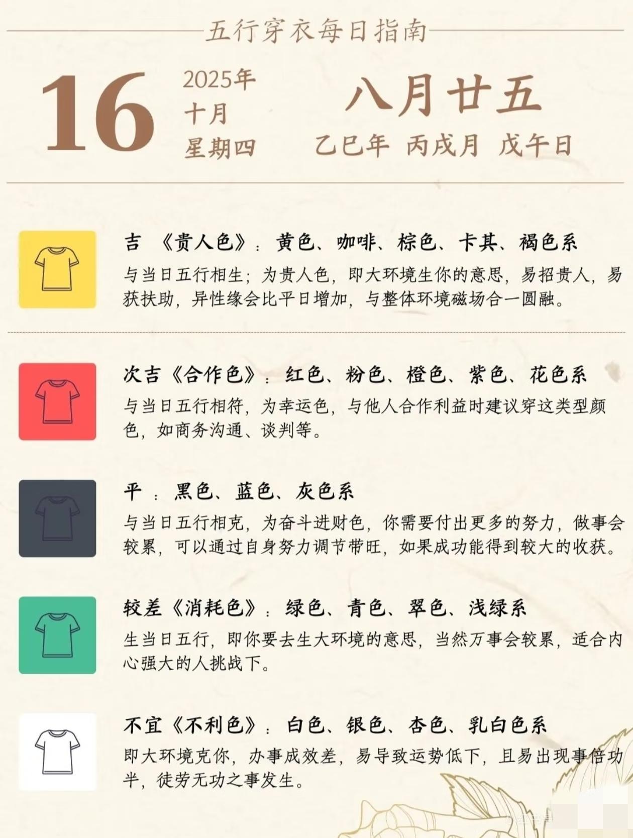 16号的穿衣指南和黄历 希望对大家有帮助 最近大家运势如何❓️ 老黄历是古人智慧的传承 古人结合节气、气候和生活经验总结的实用指南! 并非迷信哦,而是生活的参考。 助你知天时而动,择吉事而为✨ 10月16号 宜:嫁娶、祭祀、开市、开光、出行、入宅、移徙、出火、拆卸、修造、安床。 忌:纳畜、伐木、置产、作梁、行丧、安葬、修坟、立碑。