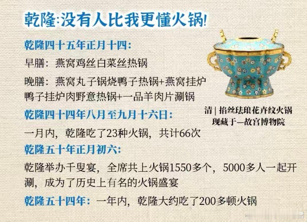 乾隆一年吃250多顿火锅 我们的故宫 别再喊早八苦了!乾隆凌晨四点就开启“打工模式”,五点吃完早餐直接上朝,别人还在睡梦中,他已经进入工作状态。原来帝王也需要“能量补给”,一年250多顿火锅,就是他的专属“早四安慰餐