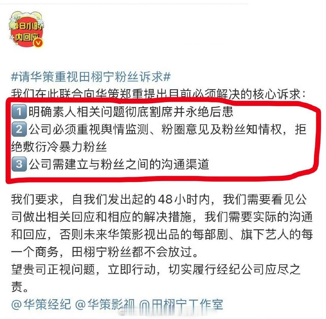 田栩宁粉丝给华策48小时回应诉求,要求明确素人相关问题,彻底割席永绝后患