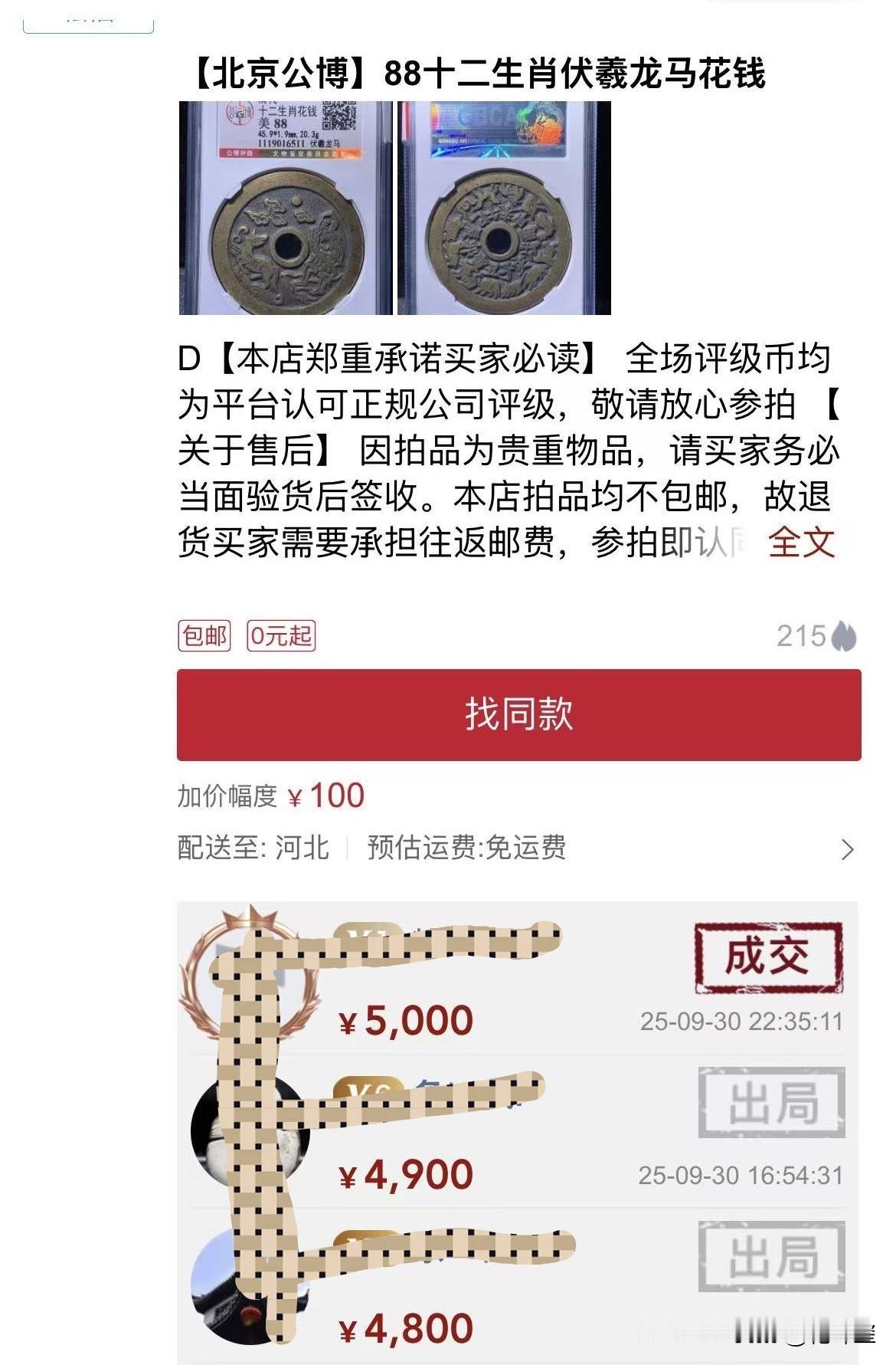 花钱成交价格? 9月30日某拍成交了一枚伏羲龙马背12生肖花钱此币为传世品,某博评级公司给出了88的高分,整体非常漂亮。直径接近46㎜,厚度1.9,币重20+克。 经过多次竞拍,以5000元成交,近几年唯独抗跌的就是高分花钱了,花钱虽然不是流通品,但是有美好寓意,多受人喜爱!古钱币花钱 千秋万岁花钱 山鬼大花钱 鎏金八卦龙摆件 黄铜山鬼花钱币 寿字龙花钱 山鬼雷霆花钱