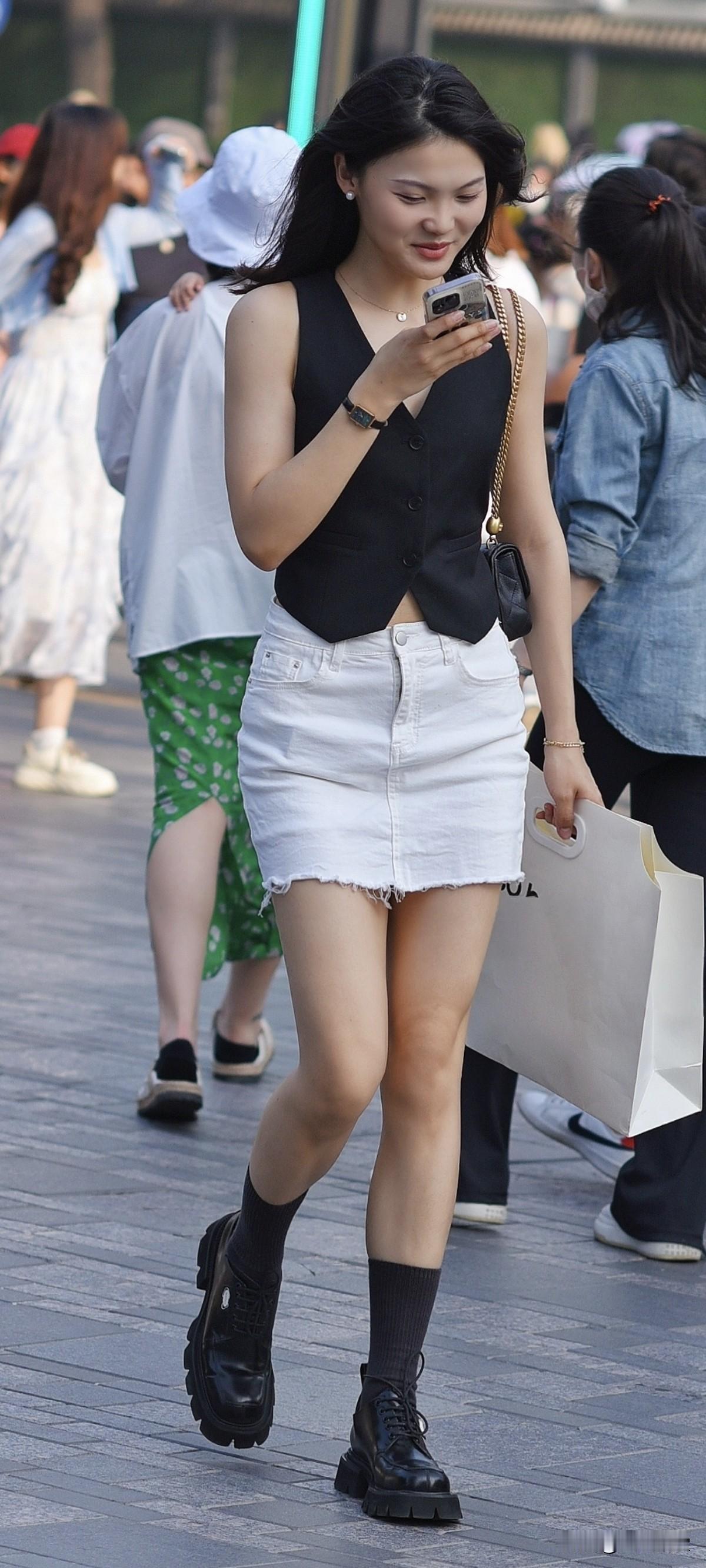 港风的西装马甲牛仔裙 !小姐姐笑的真开心!街拍城市。不一样的心动体验