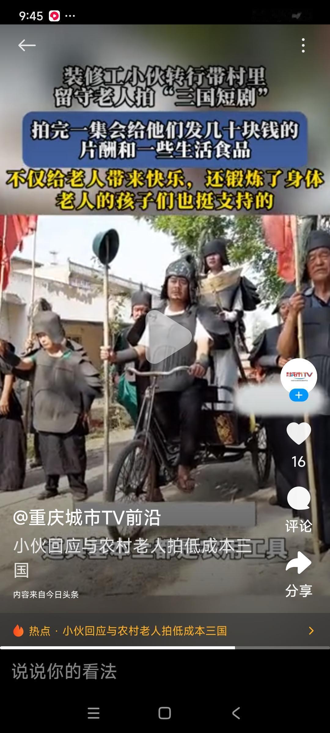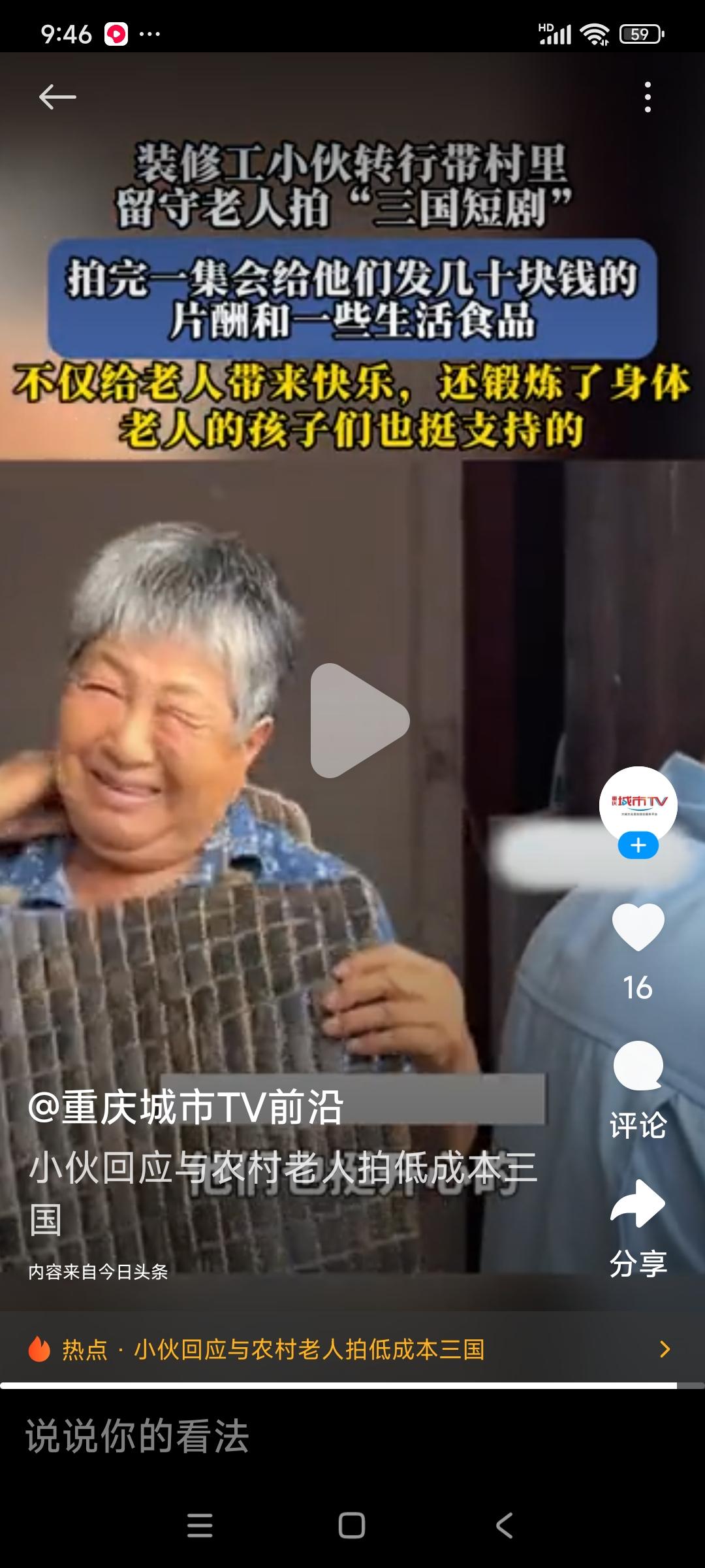 这样的生活老人都喜欢的不得了!安徽装修工小伙改行在老家拍“三国短剧”,演员都是六十多岁到七十多岁的老人,每拍完一集短剧,都给老人开几十块钱的工钱,再分给米、面、肉类的生活用品,老人们的生活不但有了乐趣还有钱赚,人人都兴致勃勃积极参与,在外打工的子女看到家里的老人开心还赚着钱,在外面即放心也高兴。这样的老年生活谁能不喜欢?好想去那里![黑线]