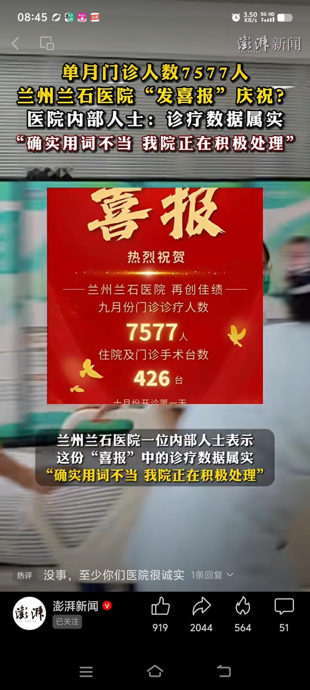 我滴乖乖,喜报都出来了。 单月门诊人数7577人,住院及门诊手术台数426台……看看兰州兰石医院发的“喜报”庆祝。这么大的红底“喜报”还真是刺眼,不知道还以为是哪位医护工作者在医疗领域获得重大突破呢。 医院可是救死扶伤的地方呀,多么神圣的地方就这样被玷污了,这是要多荒唐就有多荒唐,你让病人的家属怎么想,患者怎么想,患者还怎么相信你医者仁心呢。 说白了还是医院自身有问题。不说发内部工作群,连做都不应该把这东西做出来,生病的人多了还喜报庆祝真是悲哀,这已经偏离了其治病救人的初心了。 有网友讽刺的说:“没事,至少你们医院很诚实,过度医疗的鲜明写照”。 虽然医院内部人士回应了正在积极处理,但这事终究是心里的一根刺,被刺得很痛很痛。
