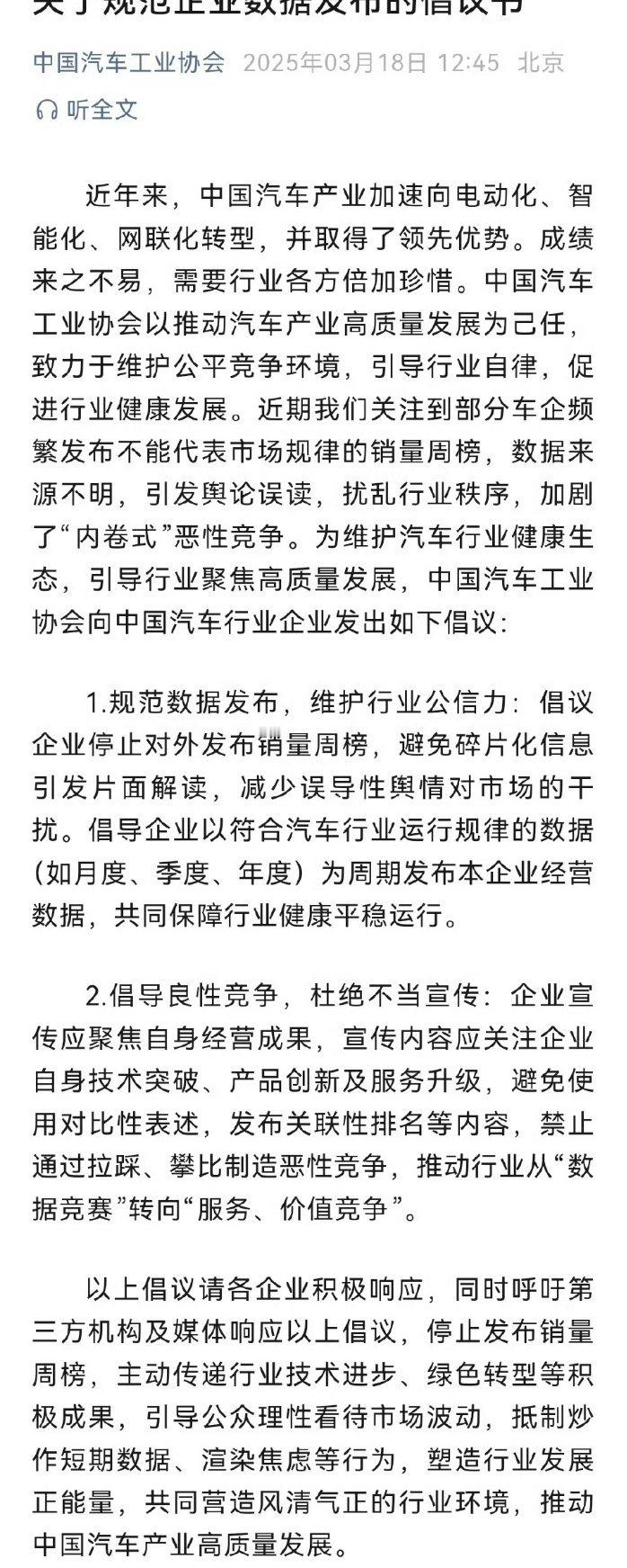 好在国家出手了,中国汽车工业协会发布了关于规范企业数据发布的倡议书,呼吁企业停止对外发布周销量排行榜,以更符合汽车行业运行规律的时间周期(如月度、季度或年度)来公布企业经营数据,以共同维护行业的健康稳定发展。这才消停了些~[无聊][无聊]
