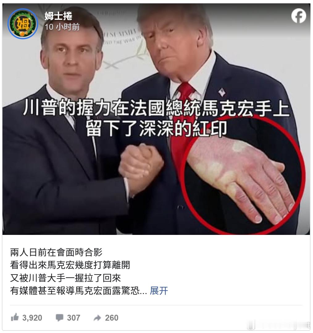 也有网友打趣说:“特朗普这是用气功握手”、“马克龙的手都白了,怕是血液循环都停了”,甚至有人笑称:“是不是身体湿气太重、肝肾不好才会发白?”