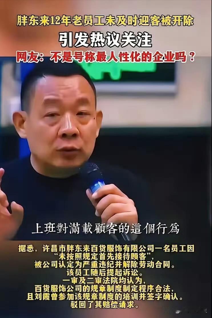胖东来员工今晚睡不着了 一名在胖东来工作了12年的老员工,因为理货时没有第一时间放下手中的POS机接待顾客,被公司以严重违纪为由辞退。法院判决支持了公司的决定。 这件事让很多胖东来的员工心里不是滋味。毕竟在公司干了这么多年,因为一次接待不及时就丢了工作,难免让人担心自己会不会因为小疏忽面临同样的结果。 胖东来向来以高福利著称,员工月收入远超市平均水平,每年还有长达40天的带薪休假。但公司管理制度同样严格,仅服务标准就有438条规定,对员工行为有细致考核。 公司规定在顾客有需求时,必须立即放下手头工作上前服务。这名老员工当时正在整理货物,未能及时迎接顾客,被监控拍下后认定为严重违纪。 法院认为公司规章制度合法,员工也参加过培训签字确认,解除合同符合法律规定。但这份判决还是让不少年轻员工感到不安,在严格的管理制度下,每个人都需格外谨慎。 胖东来在优厚待遇与严格管理之间找到了一种平衡。只是这种平衡对普通员工来说,意味着必须时刻保持高度专注,任何疏忽都可能带来严重后果。