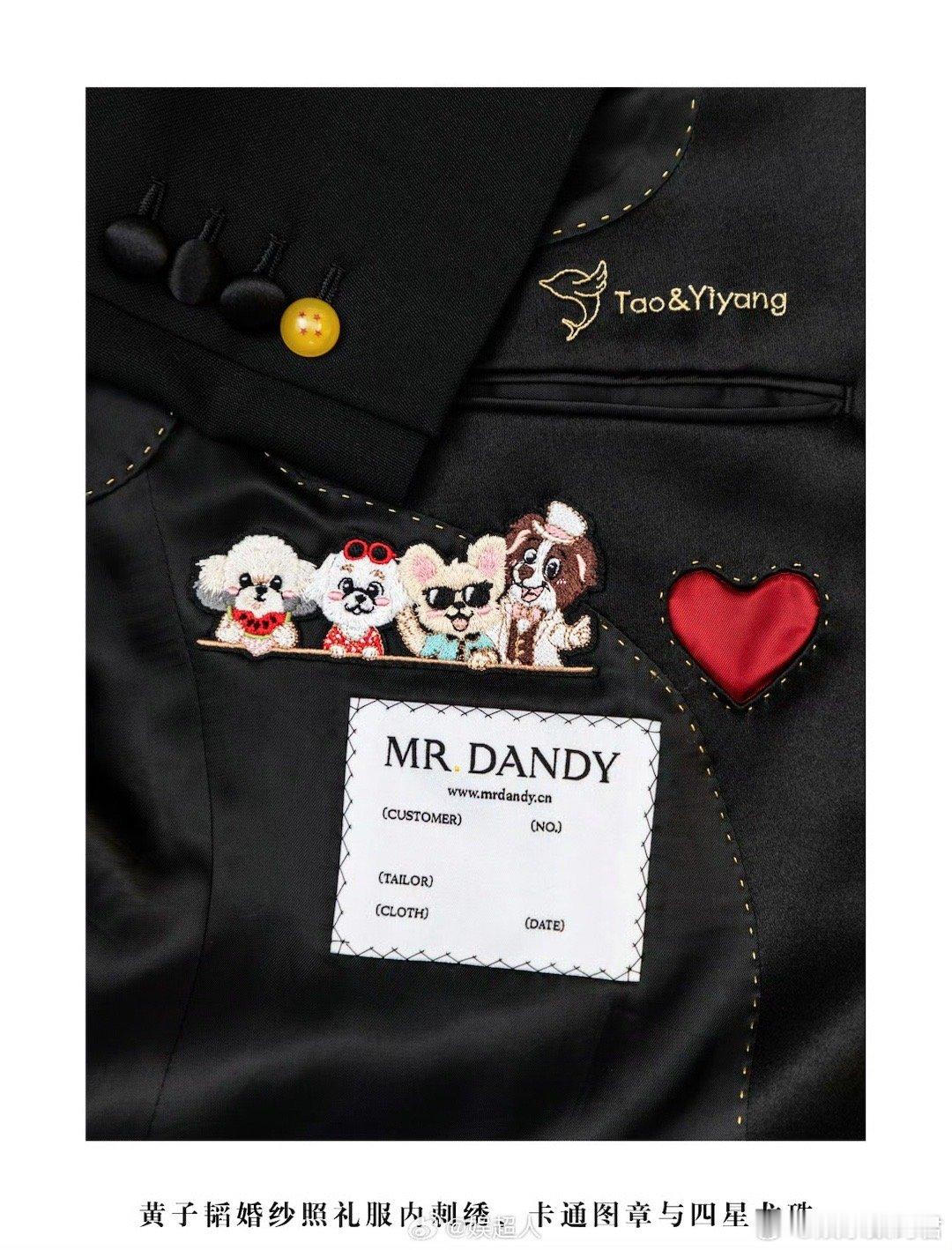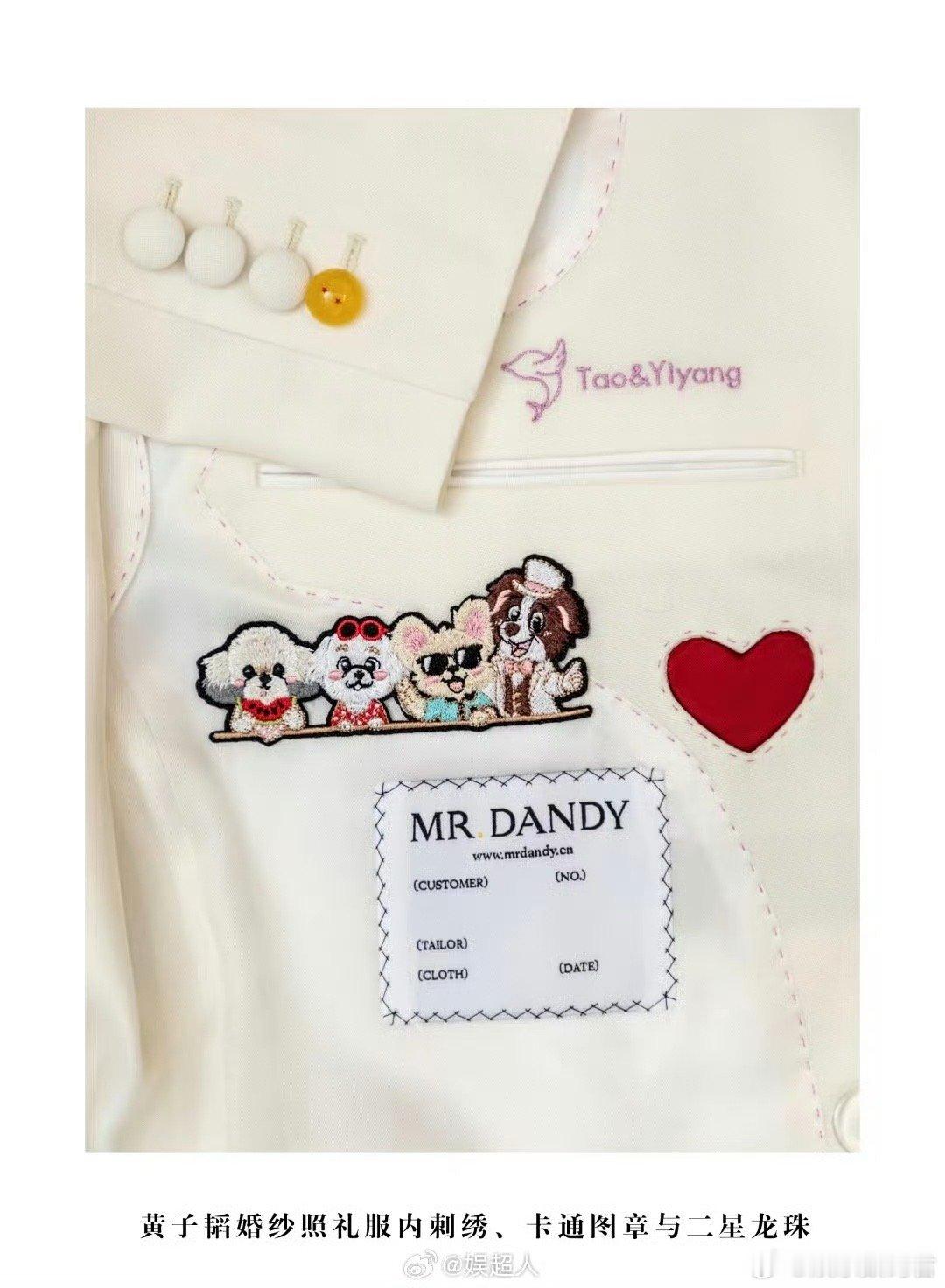 黄子韬礼服绣着徐艺洋和四只狗狗 礼服刺绣藏满甜蜜!黄子韬把和徐艺洋的四只狗狗绣在上面,还缀着小爱心,每处细节都是两人的专属回忆,浪漫值拉满!黄子韬礼服细节