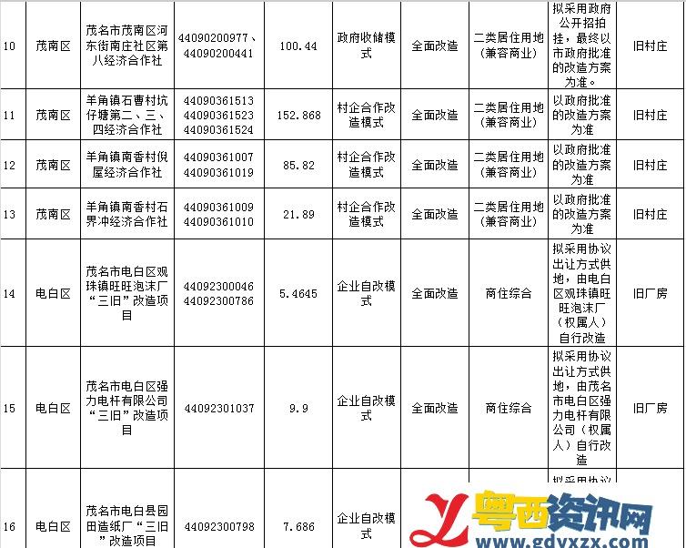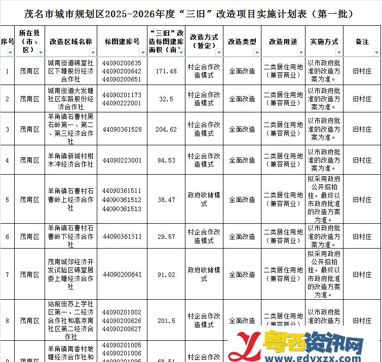 近日,茂名市自然资源局正式发布茂名市城市规划区2025-2026年度“三旧”改造项目实施计划(第一批),本批共有16个项目纳入改造计划,包括13个旧村庄项目和3个旧厂房项目,覆盖茂南区与电白区,重点推动一批交通要道的打通与土地历史遗留问题的解决。网页链接