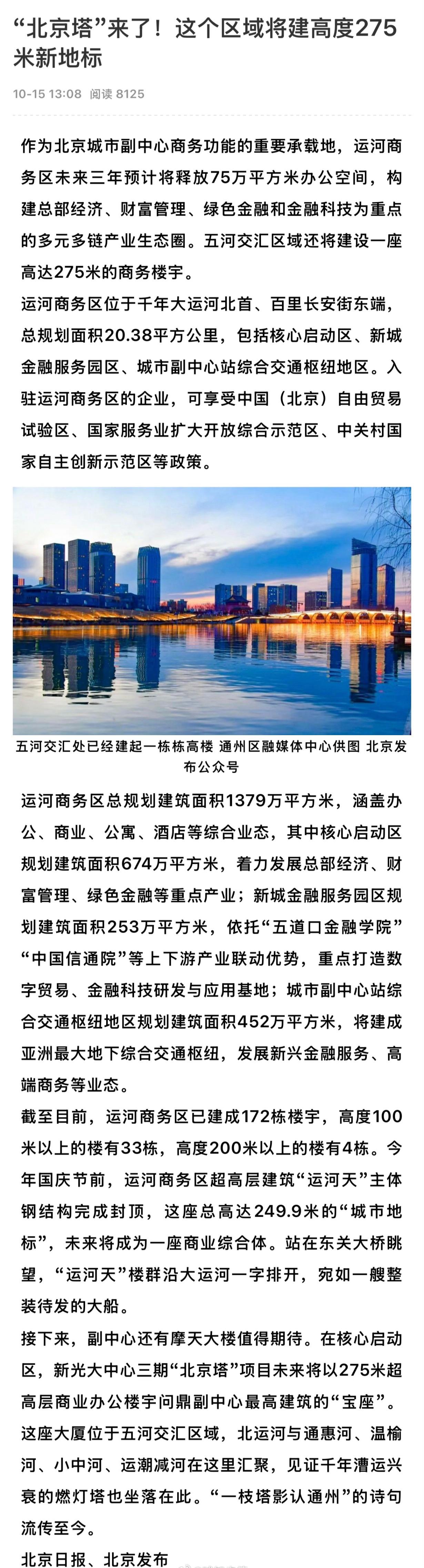 作为北京城市副中心商务功能的重要承载地,运河商务区未来三年预计将释放75万平方米办公空间,构建总部经济、财富管理、绿色金融和金融科技为重点的多元多链产业生态圈。五河交汇区域还将建设一座高达275米的商务楼宇。 运河商务区位于千年大运河北首、百里长安街东端,总规划面积20.38平方公里,包括核心启动区、新城金融服务园区、城市副中心站综合交通枢纽地区。入驻运河商务区的企业,可享受中国(北京)自由贸易试验区、国家服务业扩大开放综合示范区、中关村国家自主创新示范区等政策。北京塔来了 北京 地标 建筑