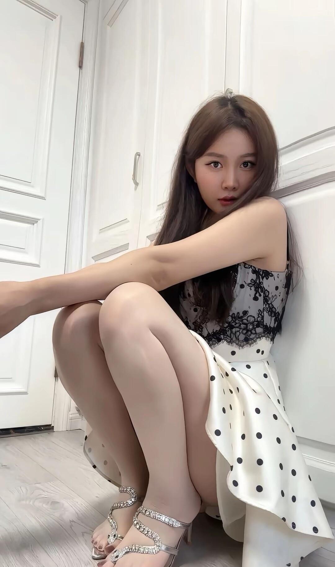 优雅黑发少女,黑白波点裙搭配闪亮高跟鞋,尽显时尚魅力!👗👠✨