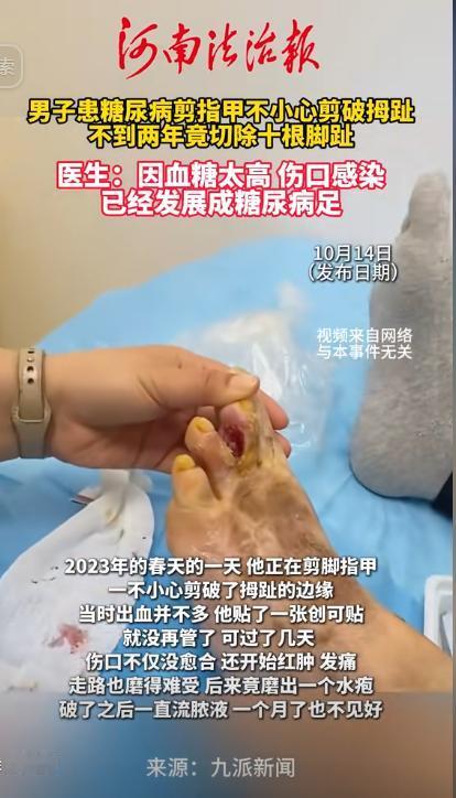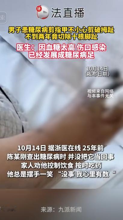 “可惜没有后悔药!”14日报道,浙江一男子剪脚指甲,不慎剪破拇趾边缘,出血并不多,他贴了一张创可贴就没再管了,可过了几天,伤口不仅没愈合 ,开始红肿、发痛走路也磨得难受,后来竟磨出一个水疱,破了之后一直流脓液,一个月了也不见好,最后导致10根脚趾被全部切除!   王大哥(化名)那天在客厅里躺着,看着电视,觉得有点无聊,看到脚指甲有点长了,于是决定剪剪脚指甲。   他拿起剪刀,坐在沙发上,轻轻把脚翘起放在膝盖上开始剪了,然而就在这时,剪刀不小心碰到了拇指边缘,稍微用力了一点,拇指的皮肤被划破,留下了一个小小的口子。   伤口很小,几乎不见血,但那种细微的刺痛感让他皱了下眉头,就随手找了张创可贴贴了上去,心里想着没大事,继续往沙发上一躺。   然而令他没想到的是已经过去了一个月了,屁大点的伤口还是没没有好转,甚至还出现了流脓的情况,见状他就立马去了医院。   到医院医生追问病史的时候,得知了王大哥早在二十五年前的时候就已经被确诊了糖尿病病,但他自己完全没当回事,因为不顾嘴,发现身体还是那样没有任何不良症状。   这时候医生无奈地说,王大哥的情况就是因为糖尿病新引起的,意思是每次感染扩散,就需要切掉一部分。最终,他不得不一次次接受手术,失去了一个又一个脚趾,直到十根脚趾都被截除。   如今,王大哥只能坐在轮椅上,翻看以前穿皮鞋的照片,回忆曾经的自己,很是后悔,每天不仅会按时吃药,在饮食方面也格外的注重,而且他现在最希望能够重新站起来走路。   事后这件事情被网友们刷到了之后,一些网友在下面评论说,他身边就有一个患糖尿病的,一点都不忌口,没过多久就熬不下去,去世了,所说王大哥还是比较幸运的。   但也有一些网友在下面评论分享自己的亲身经历,说他自己就是因为糖尿病,每次看到好吃的时候很馋但是为了能够多活几年控制自己不吃,很难熬。     那么通过这件事情告诉我们,在医学上没有侥幸可言,每一次“没事”都可能是下一次“出事”的开始。   对此,还有什么看法呢? (信息来源 :法直播 2025-10-14)