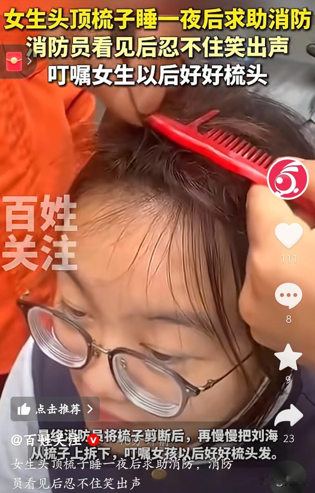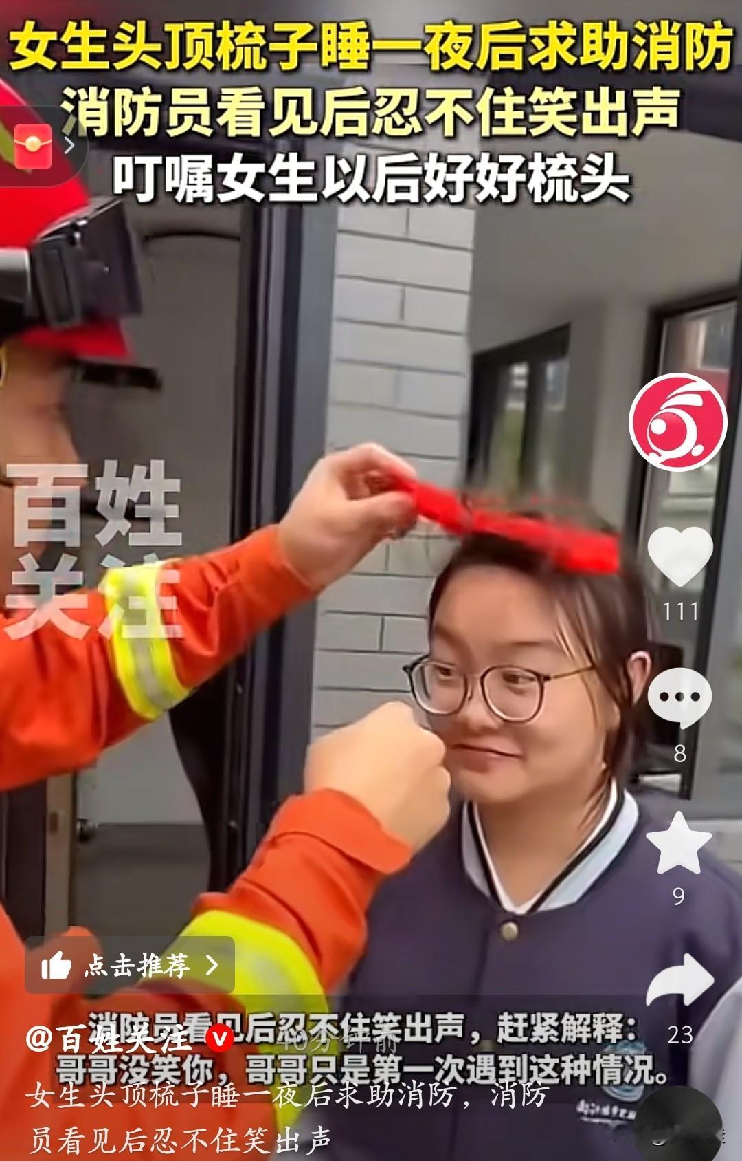 梳子卡头睡一宿,消防员憋笑来救场! 成都一女生梳头时梳子缠进头发,居然顶着睡了一夜,第二天只能求助消防。消防员一进门直接笑出声,边解释“哥没笑你,头回见这情况”,边动手救援——先把梳子剪断,再慢慢拆头发。 全程又好笑又暖心,最后消防员还不忘叮嘱“以后好好梳头”。这波操作主打一个“生活离谱,消防靠谱”,网友笑疯:头一次见梳子成“头箍”,消防小哥的憋笑快绷不住了!