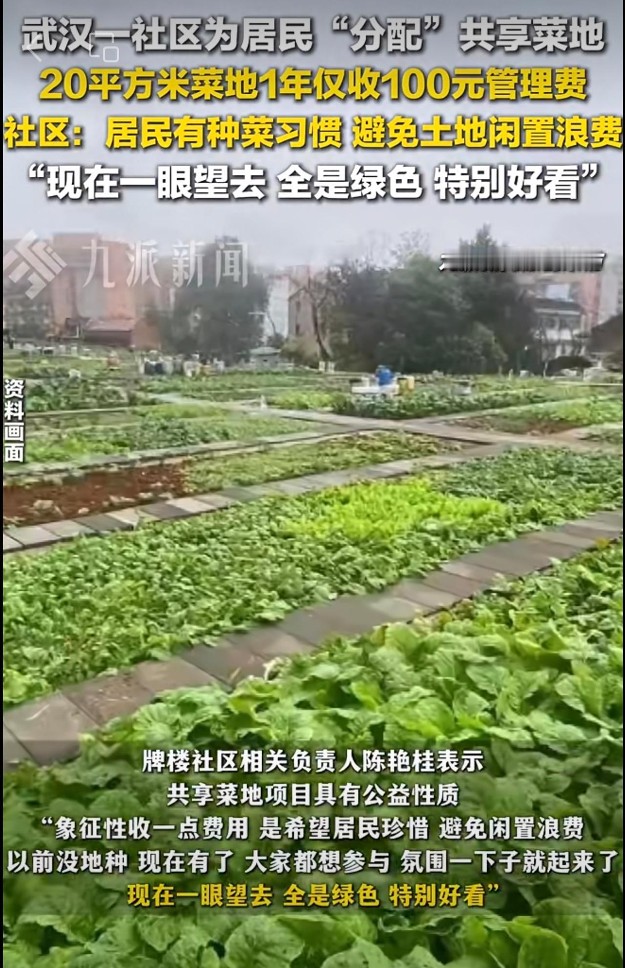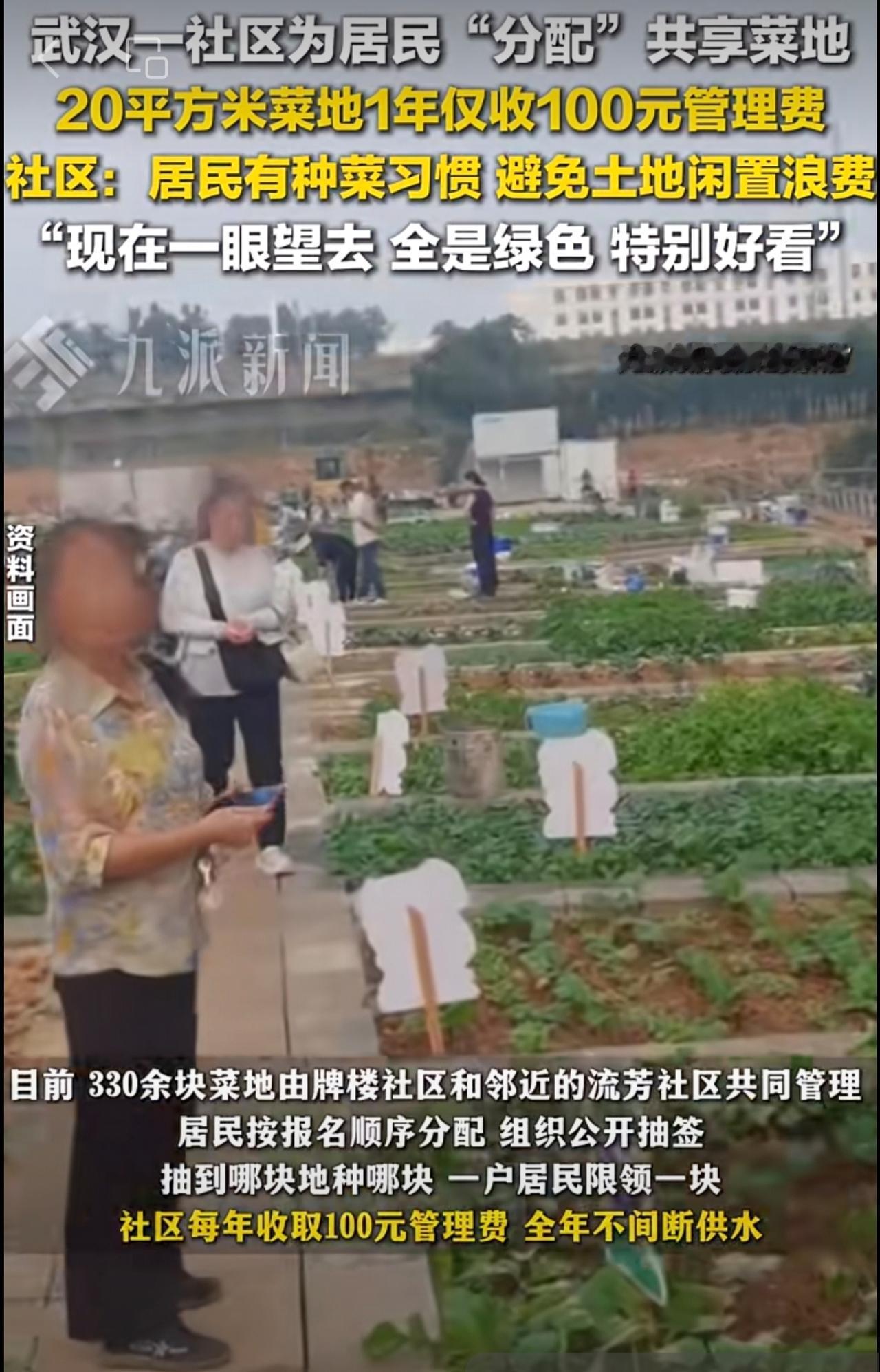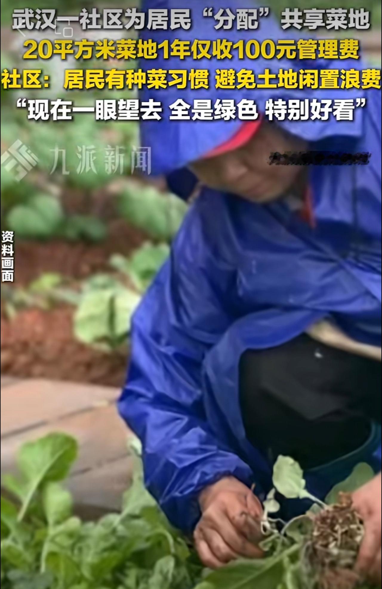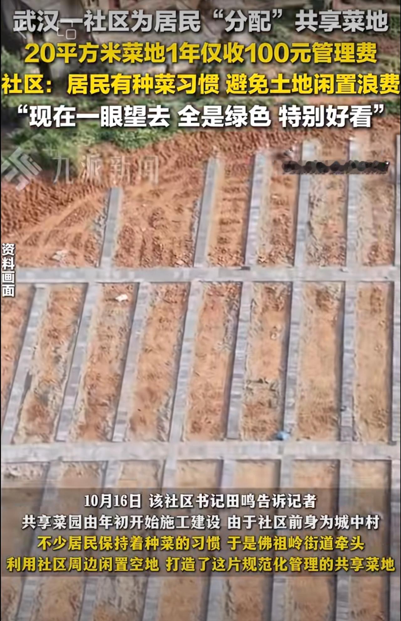 10月16日报道,武汉一社区为居民分配共享菜地 :原为城中村,居民有种菜习惯,避免土地闲置浪费,20平方米菜地1年收100元管理费。