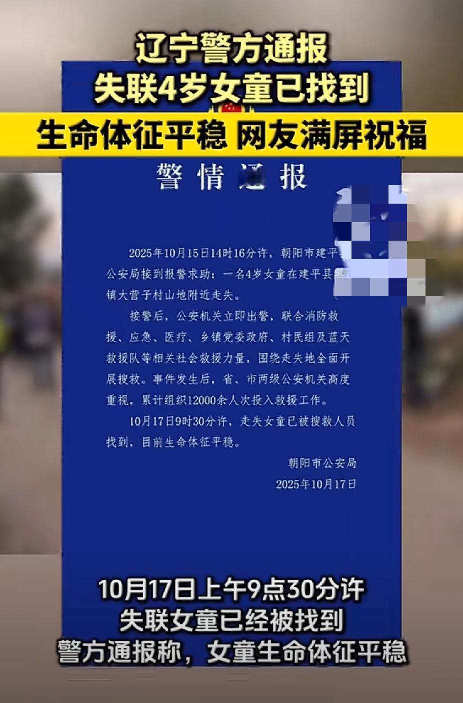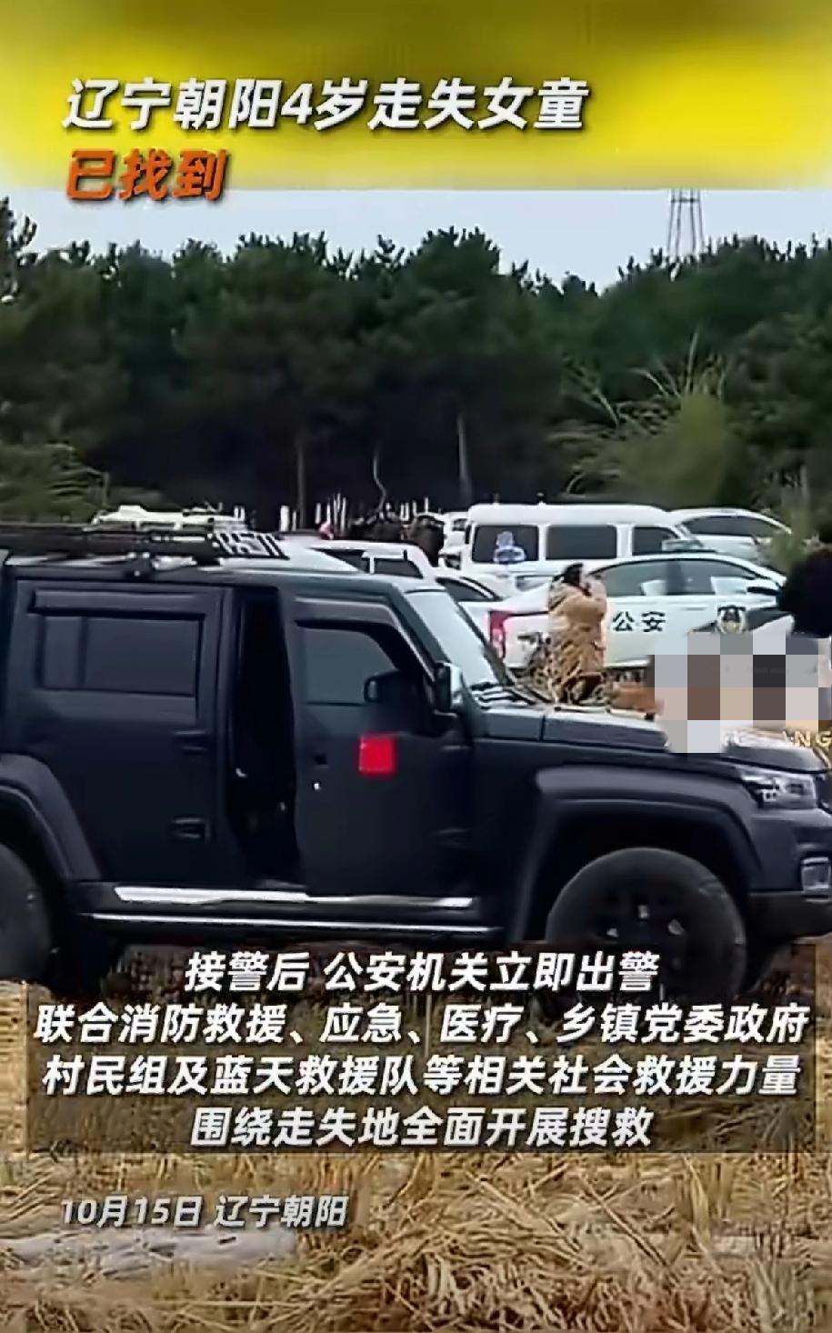 破防了!辽宁4岁走失女童平安获救,12000人搜救44小时太好哭! 家人们谁懂啊!刷到辽宁4岁女童被找到的消息,我直接激动地拍了大腿!这两天揪着的心总算彻底放下了! 15号下午,辽宁朝阳的爷爷奶奶带着孙女去地里秋收,让孩子在面包车里睡觉,转头干活20多分钟的功夫,娃就不见了踪影。车门没开但车窗被降下,事发地是山地还没监控,家属急得直哭,甚至准备了10万元悬赏 。要知道那几天当地连夜下雨,夜间温度低到零度左右,4岁娃独自在野外,想想都让人揪心! 好在咱们的救援力量太给力了!警方接警后立刻联动消防、蓝天救援队和村民,累计12000余人次投入搜救,无人机、搜救犬齐上阵,上演了一场与时间赛跑的生死救援 。17号上午9点半,好消息传来!女童在距离走失地1500米的沟壑草丛中被发现,不仅生命体征平稳,还能跟救援人员对话,喝了水吃了蛋糕补充体力,这娃的意志力也太顽强了!有网友说她聪明地躲进山洞避寒,果然是个机灵的小宝贝! 这场救援真的让我看到了中国人的守望相助!从专业队伍到热心村民,大家心往一处想劲往一处使,这就是咱们最暖的人间烟火气啊!不过开心之余也得提个醒:带娃出门千万不能掉以轻心,低龄宝宝一定要时刻在视线范围内,条件允许的话配个儿童定位手表更安心,毕竟最好的救援就是不让危险发生! 辽宁4岁女童失联获救 全民救援暖人心 儿童安全无小事 ,来评论区聊聊你带娃时的安全小妙招,或者为这群可爱的救援人员点个赞吧!