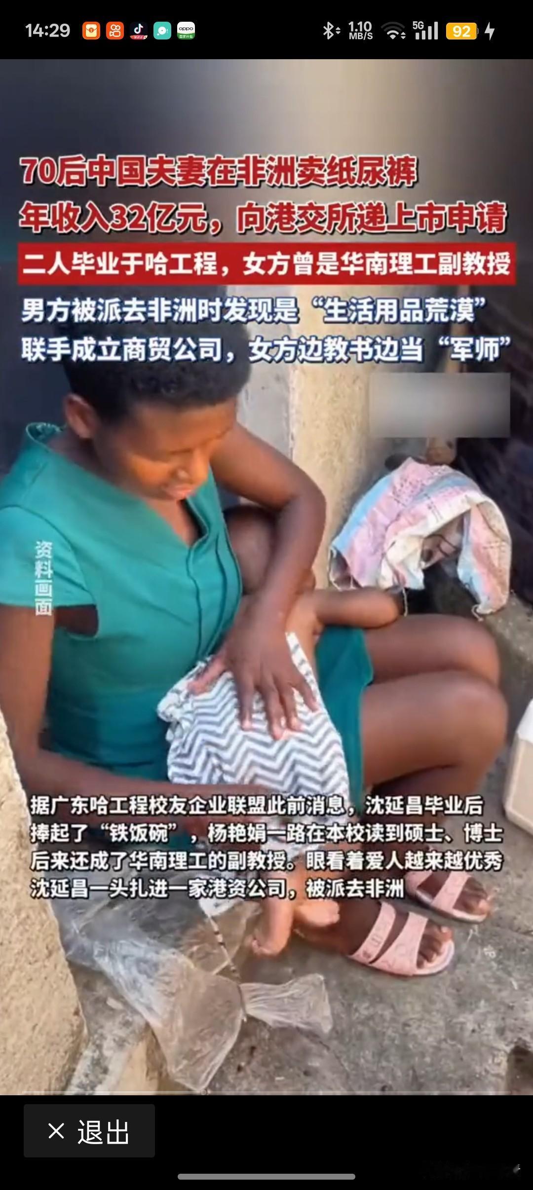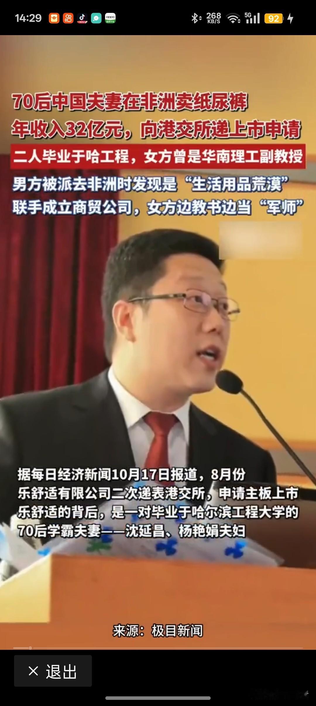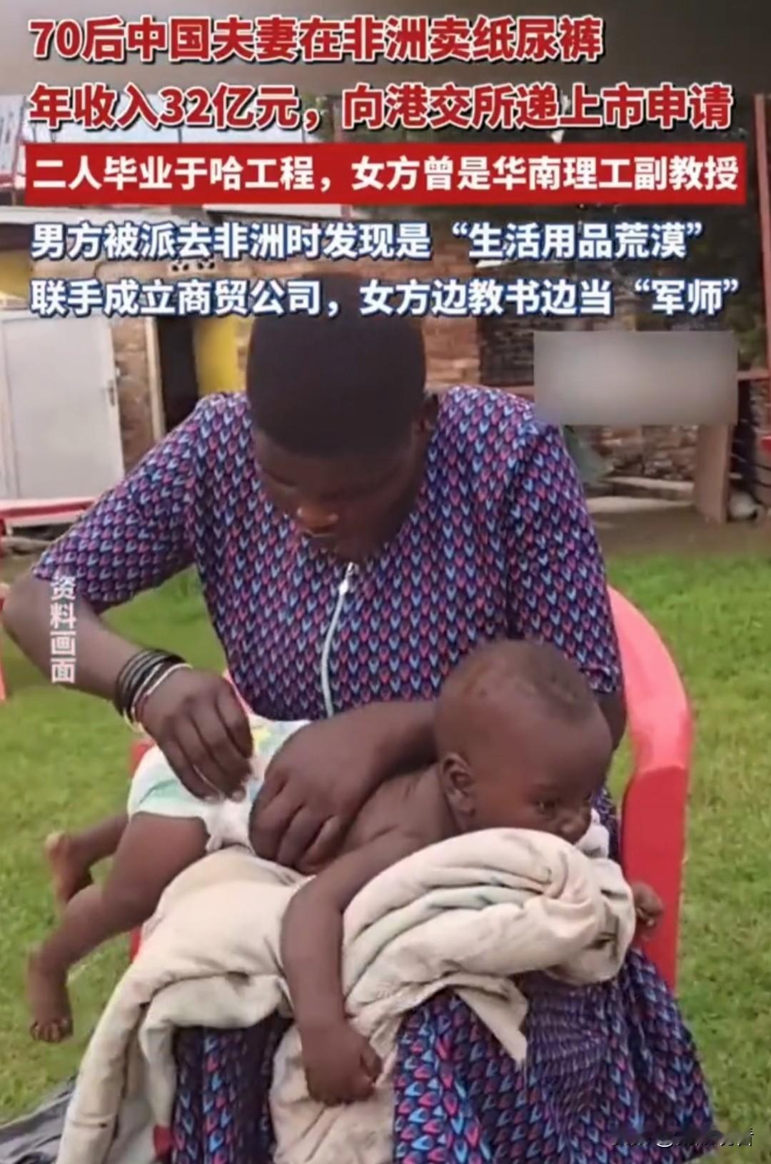 70后学霸夫妻在非洲卖纸尿裤年入32亿!你能想到吗?一对哈工程毕业的70后学霸夫妻,居然在非洲靠卖纸尿裤做到年营收32亿,现在还冲刺港股上市了! 男主沈延昌被派去非洲后,发现当地竟是“生活用品荒漠”,卫生用品又贵又难买。女主杨艳娟更牛,本来是华南理工的副教授,妥妥的铁饭碗,却果断当起丈夫的“军师”,夫妻联手搞起商贸公司。 从最初的商贸布局,到后来在加纳建工厂,一步步把纸尿裤生意做透。现在他们的乐舒适二次递表港交所,这波出海操作也太会了!果然学霸不管在哪都能发光,这商业眼光真的绝了! 中国夫妻在非洲卖纸尿裤年收入32亿