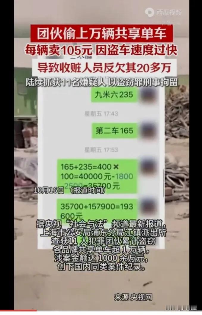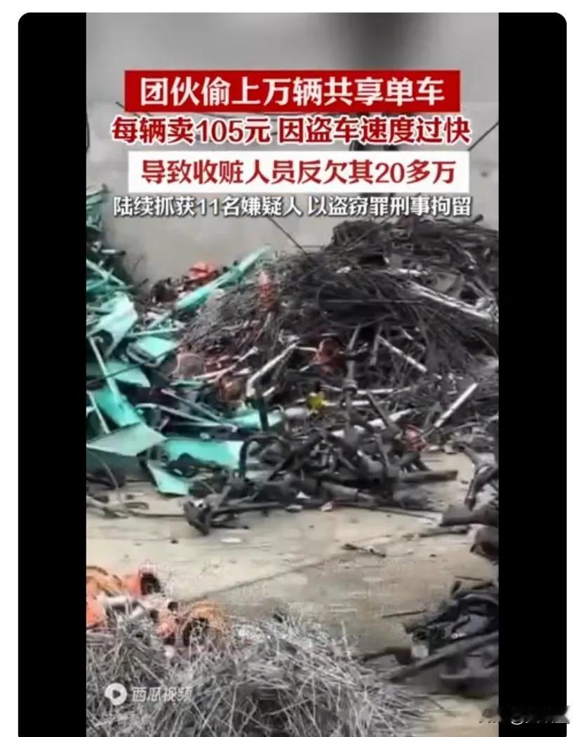 离谱!男子偷上万辆共享单车,每辆只卖105元,收赃的倒欠他20万?一夜搬空140辆,拆解当废铁卖,竟靠“效率”卷到让废品站老板破产?这伙人把共享单车当“移动金矿”,疯狂作案,最终栽了! 2023年6月,上海140多辆共享单车一夜蒸发,GPS信号却出现在50公里外的荒地。警方顺藤摸瓜,揪出一个11人犯罪团伙。他们专挑偏僻路段下手,剪断带GPS的车锁留在原地,制造“车辆正常”假象,再整车运走拆解。 更狠的是,他们贿赂前员工获取数据,专偷仓库“囤货”,累计盗窃超1万辆,涉案金额超千万!拆解后按铝、铁分类卖,每辆净赚150-200元,远超转卖价。 可笑的是,因“供货”太猛,收赃人员根本消化不了,竟倒欠团伙20多万!但法律的账他们没算清:主犯李某新被判13年,罚50万!偷一辆价值2100元的单车,就够拘留15天! 共享单车不是“唐僧肉”!别为小利毁一生!共享单车 共享电单车乱象