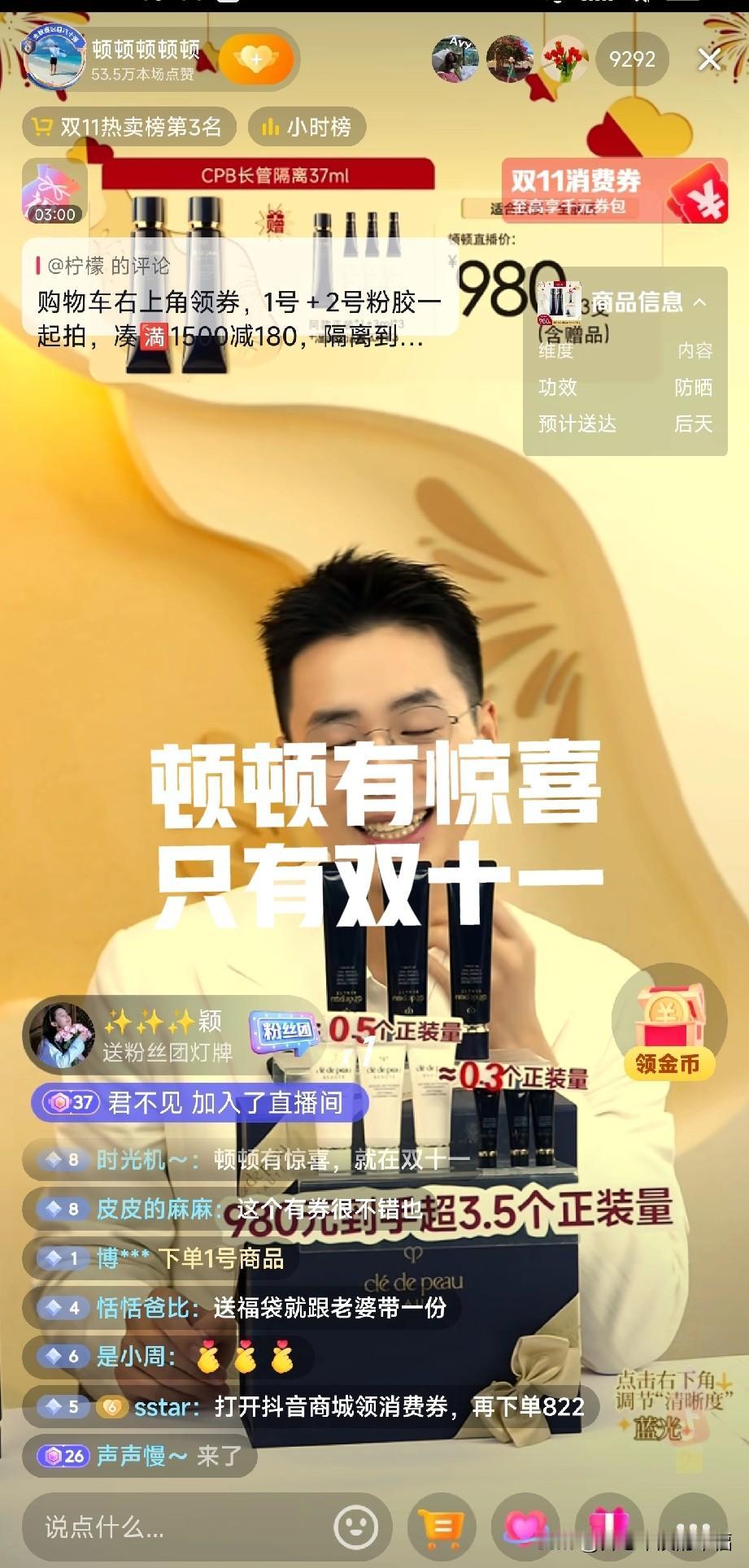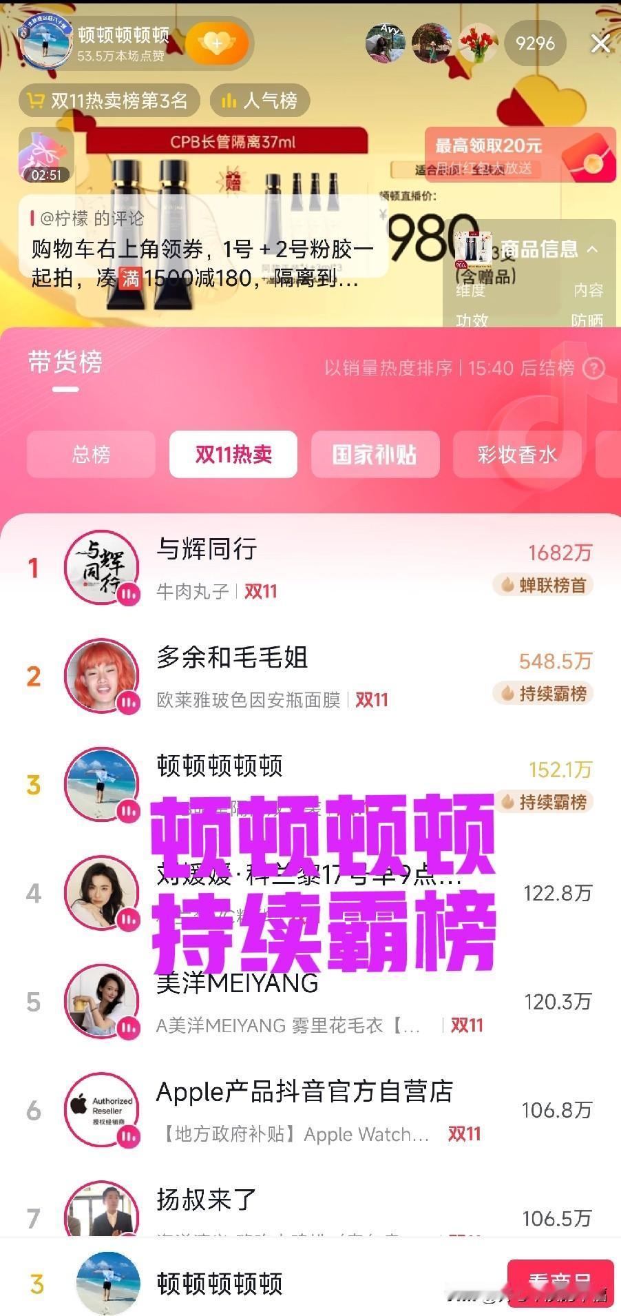 顿顿很开心,眼睛时不时的看一看排行榜。 双十一顿顿很卖力,接连直播,依旧精神抖擞,大家对顿顿还是比较信任的,特别是美妆护肤方面。看看排行榜吧顿顿已经做到了第三名,商品厂家直供,双十一还有优惠,一直青睐该品牌的消费者,怎能不心动呢? 其实在这里真的感谢俞老师,新东方转型东方甄选也是一个机遇吧?是给新东方的一个机遇也是给消费者的一份回报,让市场更透明,让消费者更能买到放心的产品。