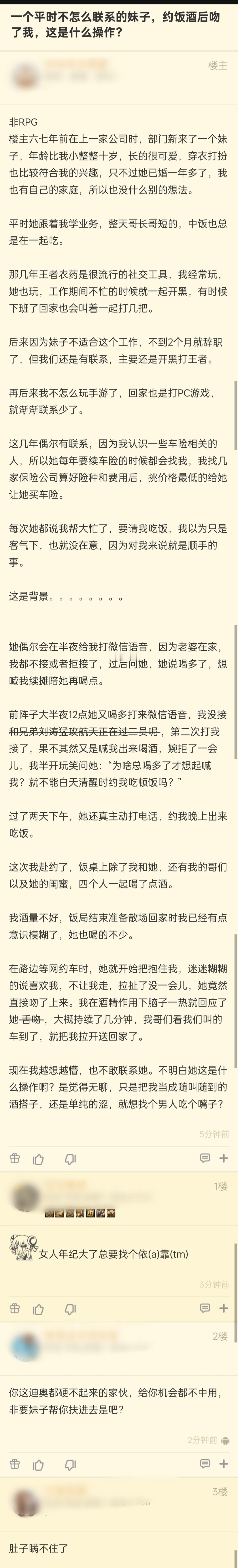 “平时不怎么联系的妹子,约饭酒后吻了我”