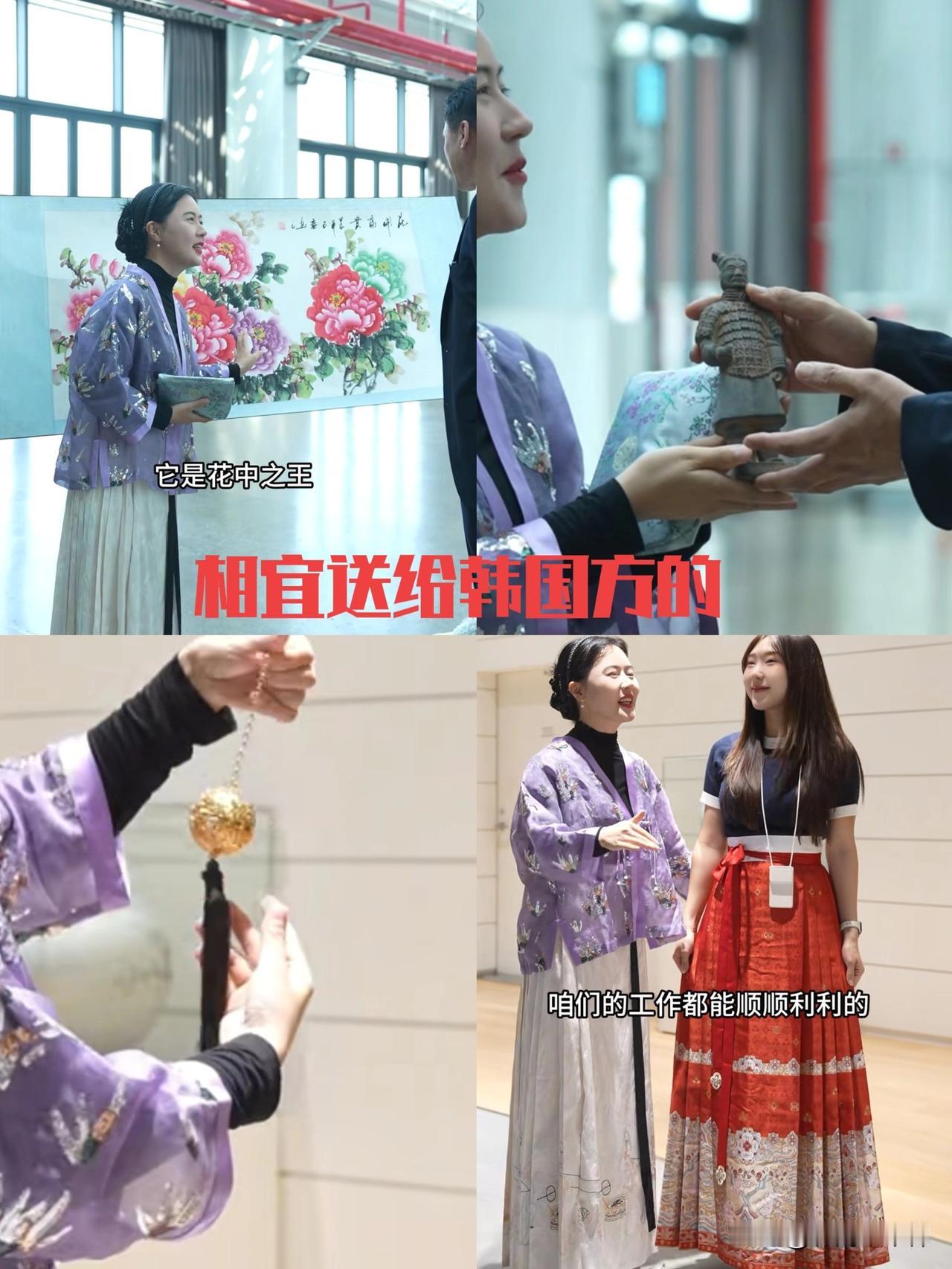 相宜跟韩国人互送礼物真不少,一会儿你掏出来一个,一会儿我掏出来一个。 兵马俑小人儿,葡萄花鸟纹银香囊,马面裙,牡丹花,我真觉得相宜这几个礼物挑的不错,一是在陕西很好买到,二不是多贵重,但都带有中国历史文化元素,重在有意义! 韩国方则是送了一束花,一套爱敬伴手礼,和代表韩国的纸扎人。 收纸扎人的时候,相宜很聪明的提到“造纸术在唐朝传到了韩国,叫韩纸,做成了这样的布偶。” 无论相宜风评如何,这波文化交流我站相宜,大家觉得相宜这些礼物挑的怎么样? 相宜 相宜带货 相宜疑因直播时说3次“我们日本”辞职