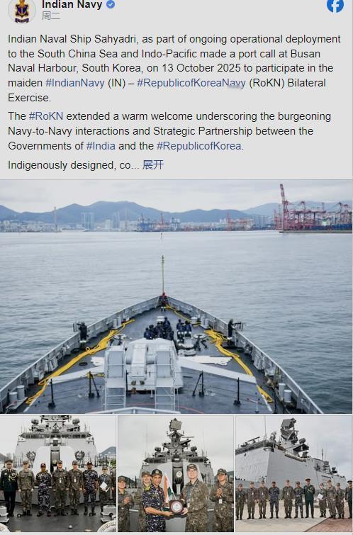 印度媒体称印度派遣军舰到中国家门口去演习了 印媒《新闻周刊》(Newsweek)10月16日报道,印度萨希亚德里号护卫舰(INS Sahyadri)周一即10月13日访问了韩国釜山,进行两国间的首次海军演习,“正值中国寻求在有争议的水域保持强大的海军存在,来军事化其与韩国之间的黄海。”印军声明称“印韩越来越认识到基于共同利益建立合作伙伴关系的重要性”。印度派遣军舰到中国家门口了。