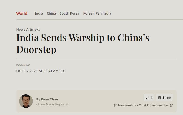 印度媒体称印度派遣军舰到中国家门口去演习了 印媒《新闻周刊》(Newsweek)