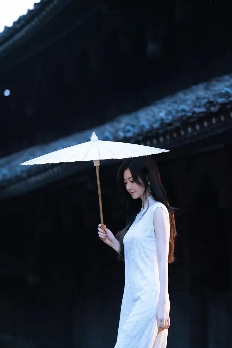 景甜穿白色旗袍气质温婉 手撑油纸伞端庄大气