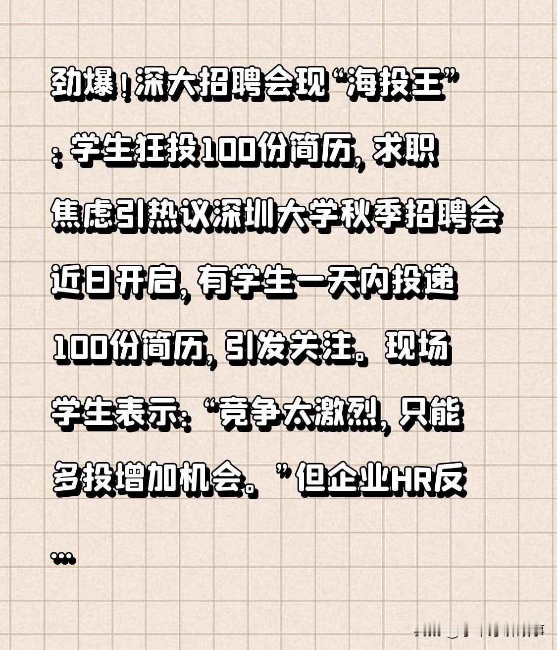 惊爆!深大招聘会惊现“海投王”:学生猛投百份简历,求职焦虑引热议 深圳大学秋季招聘会近日拉开帷幕,有学生一日内投出100份简历,备受瞩目。现场学生称竞争激烈,多投以增机会。企业HR却表示,简历量增但匹配度低,筛选难度加大。专家建言精准投递,盲目海投或降效率。网友热议:“投百份简历是积极还是焦虑?”“00后求职咋卷?”💬📊(来源:深大就业中心数据)
