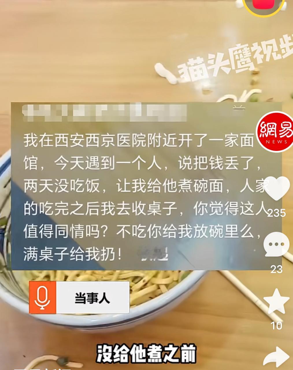 素质太低了!陕西西安,一男子走进饭馆,对老板说,我已经两天没吃东西了,能不能给我弄点吃的?然而,当老板特意给他端来一大碗面条后,男子接下来的做法,可把老板气够呛! 10月9号这天,在西安西京医院附近一个小饭店内,老板正忙着招徕顾客。 “你好,能给我点吃的吗?”忽然,一个懒洋洋的声音响起,老板扭头一看,不知道什么时候进来一位中年人,大约四十多岁的样子。 见老板迎上来,中年男子接着说道,“我钱丢了,到今天都两天没吃饭了,所以,请行行好吧?” 自从开饭店以来,像这种情况他曾遇到过好多次,每次都没收过钱;他认为,出门在外,谁都有可能会遇到困难,对于真正需要帮助的人,他愿意伸出援助之手。 这次也不例外,问过男子口味,老板特意盛了一大碗面条给他。 但是,让老板没有想到,在接过面条后,男子又提出想要些钱。 这立刻引起老板的警觉,再细看这位男子,见他眼神飘忽不定,神态懒散,不像有正常职业的人。 于是,老板告诉他,自己只是饭店的伙计。说完,就忙着招呼别的客人去了。 然而,当忙了一圈回来,看了一眼桌面,可把这个老板气坏了:只见桌子上扔的到处都是挑出来的土豆和豆腐,筷子扔在一边,碗里还剩下小半碗面条子。 而那名男子,不知何时已经走了。 老板气不过,接连讲好几句“真没素质!”就把视频发到了网上,引起好多网友评论。 有个网友是这样说的:“你这是碰到好的了,有一次,我店里来了俩人,点了三盘子菜,啤酒喝了一捆,最后吃饱喝足了才说没钱,当时把我给气的……” 有的网友说,不是要不要钱的问题,那家伙就是个骗子,跟骗子谈啥素质不素质的。 其实,他说钱丢了肯定也是托词,这年头,只要手机还有电,没钱了可以直接朝家里要,拿钱丢了当借口,也就骗骗傻子吧。 所以,他这不是真饿,是来要钱的而已。 你说呢?