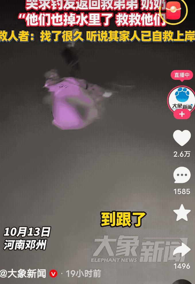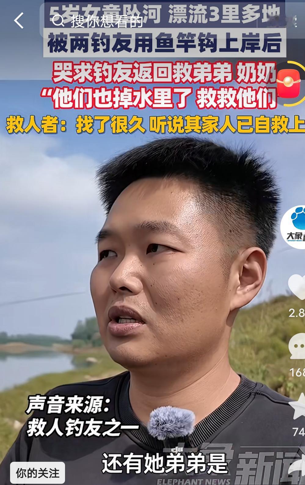 河南邓州,一个5岁女孩不慎落水,顺流漂了3里路,然而当她获救后,说出的第一句话,令人破防了! 10月13号傍晚,两个钓友在河边钓鱼,忽然,从河的上游,隐隐约约听到似有孩子的哭声,只是当时离的较远,两个人并没有放在心上。 但是,过了一会儿,随着哭声越来越清晰,越来越近,仔细一看,原来是一个穿粉色衣服的小女孩,正顺着水流漂过来。 但是,女孩离岸边较远,流水还急,下水施救肯定有一定风险。 见此情景,一个钓友灵机一动,赶紧起身,他一边安慰小女孩不要害怕,一边甩出钓钩,他想把小女孩儿钓过来。 但是当时有风,试了几次才把小女孩的衣服钩住,可小女孩并不知道用意,看到把衣服钩住了,竟害怕的挣扎,想把钩子打掉。 钓友见状,立即告诉她别动,这是在救你,小女孩这才安静下来。 谁都没有想到,小女孩被救上岸后,说出的第一句话便令人破防了,她声音颤抖着说,“奶奶也掉水了,还有弟弟,请一定要去救救他们。” 于是,两个钓友立刻报了警。 之后,两个人又顺河边,找了很久,直到听附近人说,人已经救起来了,两人这才离去。 经事后了解,这个小女孩才5岁,这天,爷爷和奶奶,带着她和弟弟过桥,四人竟都同时意外落水,其他三个爬上了岸,只有这小女孩顺流而下,直漂了三里多地。 对着镜头,爷爷感谢说,要不是两个好心人施救,以后就再也看不到孩子了,说完禁不住掩面痛哭 。 看来,世界上真有这样的孩子啊,明明自己还需要照顾,却首先想到家人安危问题,这种孩子,生来就是报恩的。 有人说,小女孩一家四口没能遇难,是这个社会有爱的结果。我也以为,真是这样的。