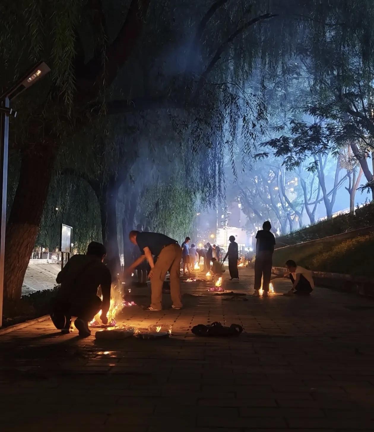 今天中元节,许多城市街头巷尾都燃起了一堆堆火光,三五成群的人们在十字路口画圈焚纸