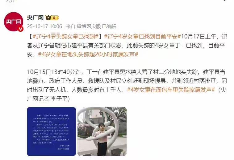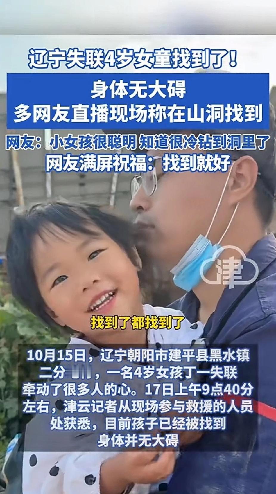辽宁失踪两天两夜的4岁小女孩找到了! 真是奇迹啊,小女孩特别的聪明,这两天下雨🌧,她自己钻到山洞里面去了。 据悉,此次搜救,历时两天,投入人数最多的时候高达上千人,另外还出动了无人机。 万幸,在大家的共同努力下,孩子最终找到了,这就是天大的好消息。