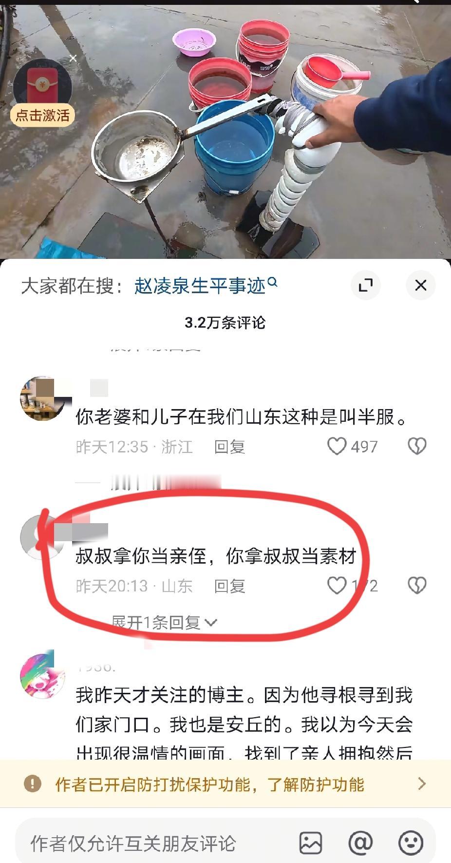 一条寻亲视频感动5000万网友,后续又让无数网友感到心寒,博主关闭了评论区。 10月13日,一博主去山东寻亲,路上碰到一名五六十岁左右的大叔便上前问路。 一开始大叔警惕性很高,但是当他听到博主说出“赵凌泉”三个字的时候表情瞬间由警惕转变成欣慰和惊喜,大叔对博主说:我是你的叔叔。原来这位大叔就是博主的亲叔叔。 看到眼前的侄子,大叔表现的非常高兴,拉着侄子的手就往家走,到家以后还特意嘱咐家人去买了一大桌子菜摆满了桌子。同时叫来了家族里的几位亲人一起过来招待这位远方过来的侄子一家人。 但是视频后续发生的事让无数网友感到气愤。 原来,当叔叔的家人过来时,坐在沙发上的侄子的儿子和老婆没有主动起身叫人问好,网友认为他们没有礼貌。 另外,当其他人还没有落座的时候侄子和他的家人却开始动筷子吃上了,这让无数网友感到气愤,认为他们连最基本的礼数都不懂。同时还有网友从博主家人的表现分析他们好像看不起这家乡下的穷亲戚。 吃完饭以后,博主带着家人就走了,有人指责博主没有礼貌,去叔叔家空着手去,临走也没有买任何礼物给这位热情招待他们一家人的叔叔。对此博主的说法是叔叔不要他们买礼物,但是网友不买账,说叔叔不要你就不买了吗? 评论区一开始从感动到后来无数网友的指责和说教,让博主不得已关闭了评论区。 对此评论区有一位网友说:叔叔拿你当亲人,你拿叔叔当素材。