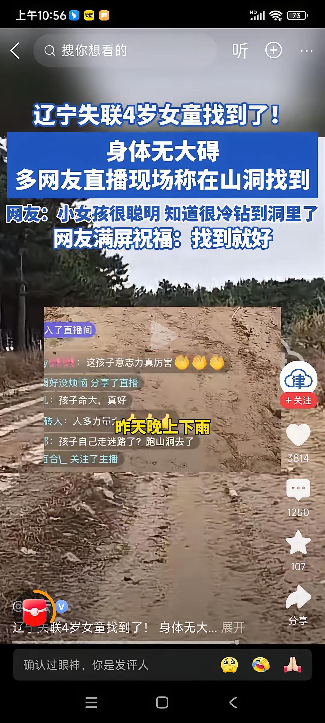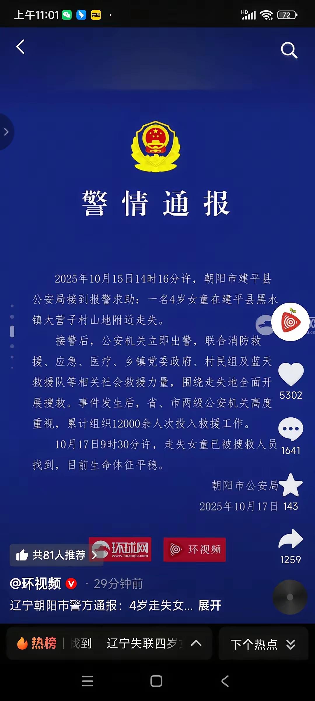 那个四岁的孩子找到了。 在离家一千五百米左右的沟壑里,躲过了两夜零度的雨。 她说饿,救援人员递过去蛋糕和水,她安静地吃了。 车窗原本只留了缝,她却自己摇下一半,走了出去。 这一路,无人机在天上扫,搜救犬在地上闻,一万两千人次弯腰找过每一片草丛。 孩子不太说怎么过的这两夜。但她记得躲雨,也知道冷。 人多,山就不显得大了。
