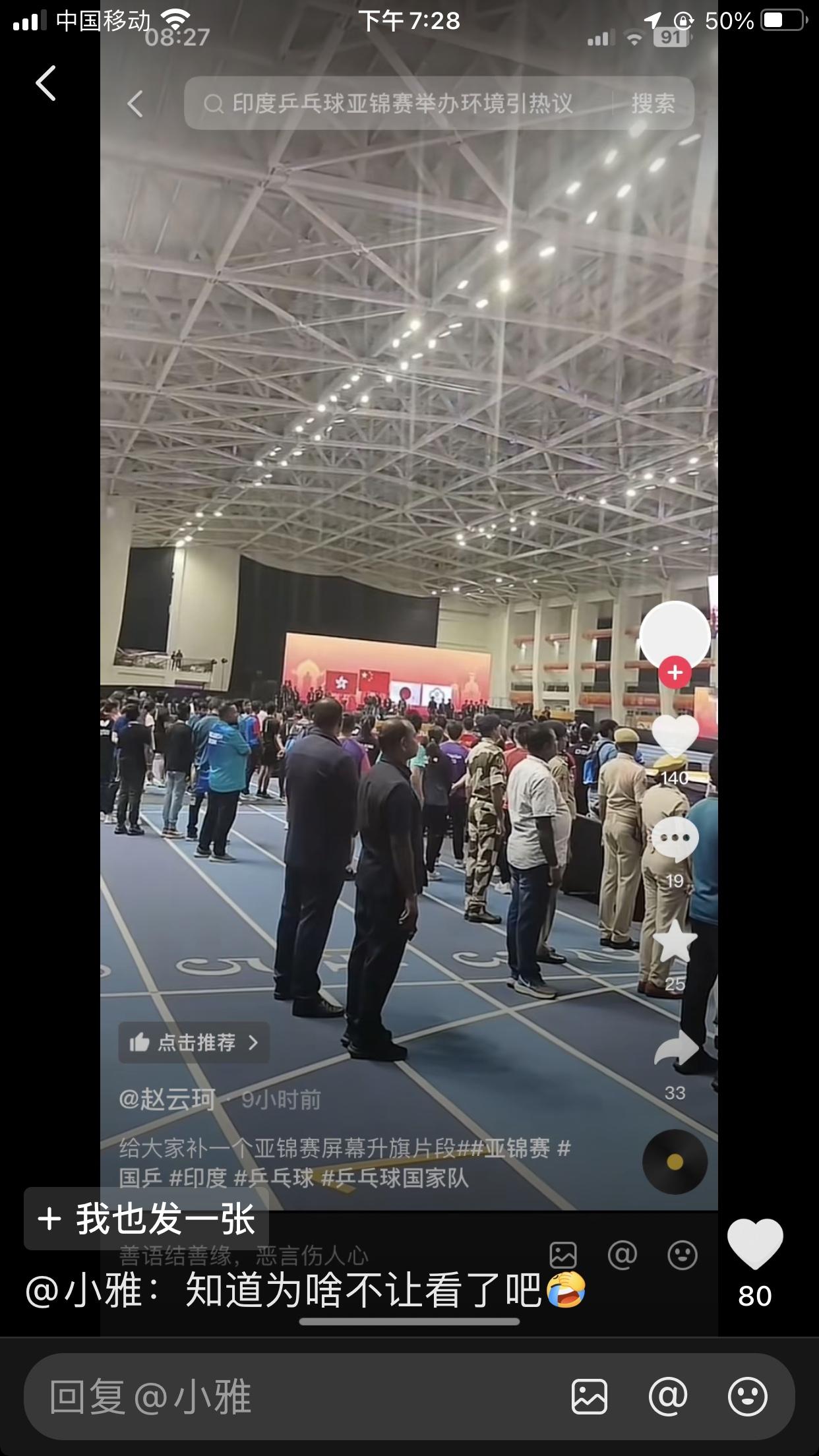 你知道印度亚锦赛看不到升国旗吗?镜头只看到运动员。原来他们没有升国旗那个升降杆[捂脸]是升的电子国旗,而且只有一台摄像机,镜头都不知道怎么切换[捂脸]因为整场只有一个机器拍,拍了国旗就拍不了运动员了。 太难了,辛辛苦苦赢得冠军,连升国旗的镜头都没有[酷拽] 感觉不把国歌给我们放错就不错了,对他们国家要求高了他们也完不成[呲牙],金牌拿了,我们的运动员们安全回国就行[赞]