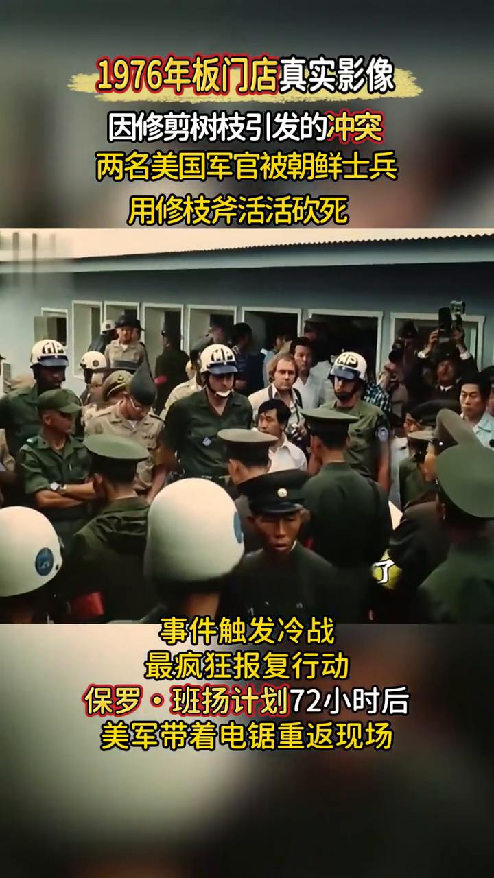 1976年板门店真实影像。 因修剪树技引发的冲突,两名美国军官被朝鲜士兵用修枝斧活活砍死。冲突根源在于这棵杨树阻挡美军监视视线,险些引爆第二次朝鲜战争。 这棵位于"不归桥"旁的杨树阻挡了美军第5观测站对朝鲜哨所的监视视线。美韩小分队来到朝军驻守的哨所附近砍树,结果引发同朝鲜官兵的群殴。混战中朝军抢过斧头,头骨碎裂当场死亡。巴雷特中尉重伤不治,事件触发冷战最疯狂报复行动。保罗·班扬计划72小时后美军带着电锯重返现场,最终朝军沉默目送杨树倒下。金日成罕见致歉称"遗憾"。 此次事件以后韩国和朝鲜进入军备竞争。