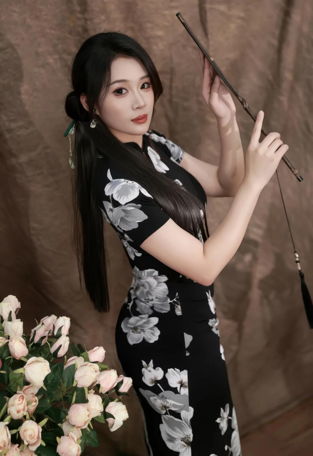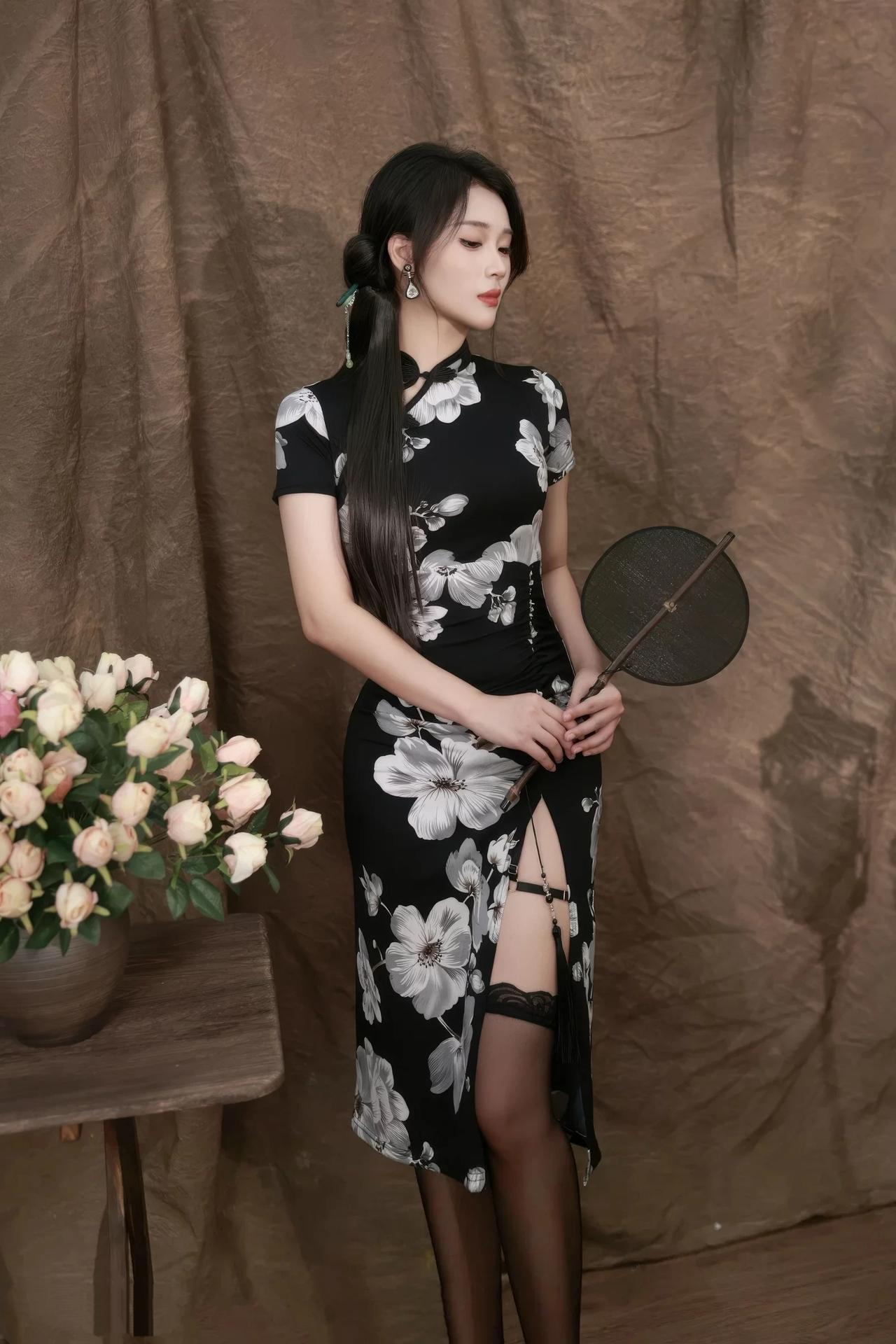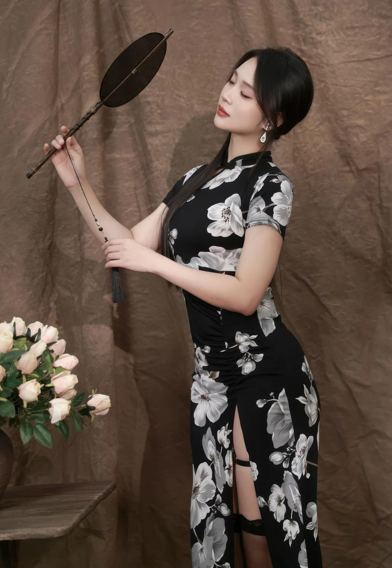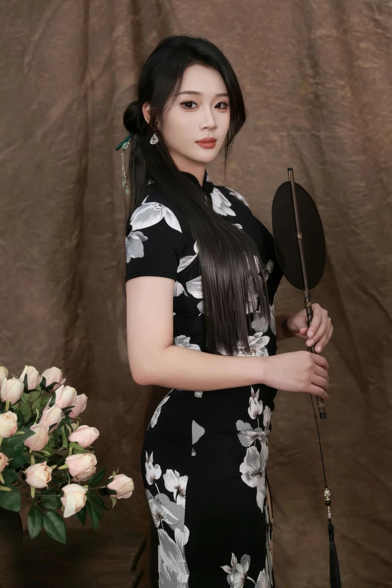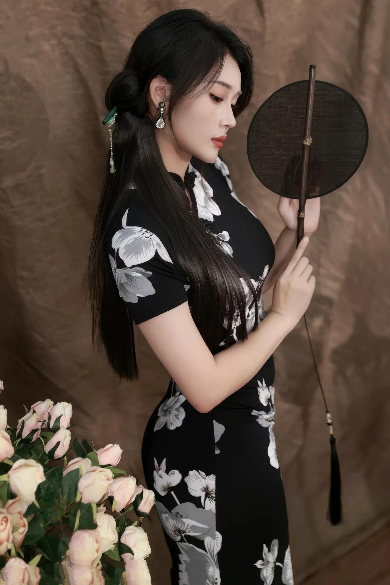优雅黑裙女子,手持团扇,静坐花丛间,古典韵味十足。御姐
