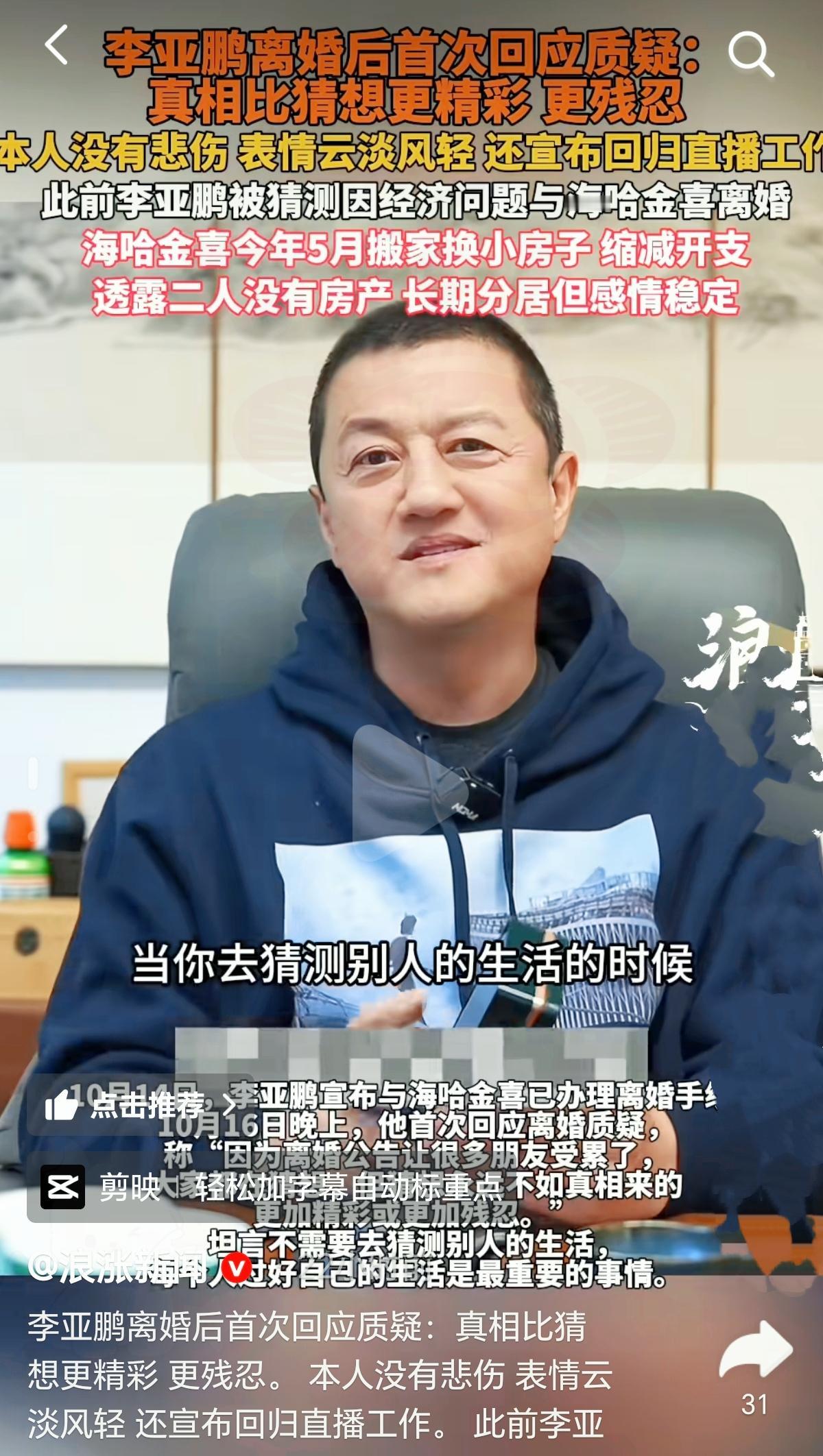 李亚鹏那几句“真相比猜想更精彩也更残忍”,哪是回应离婚啊,分明是成年人藏起无奈的体面宣言。 别光盯着“离婚”俩字嚼舌根了,他这操作里全是现实的重量。身负巨债还被限高,和海哈金喜连套房产都没有,住的还是租来的小房子。所谓的“分开”,更像他不想拖累妻女的主动退让——毕竟总不能让年幼的孩子跟着背负债务阴影,连岳父母都得搭进来帮忙带娃做饭。 这不是他第一次这么“扛事”,当年和王菲离婚,哪怕自己经济崩盘也没让女儿李嫣缺过学费,更没拿孩子说事。现在刚官宣离婚就转头直播带货,哪是冷血分明是要挣钱还债的迫切。 比起狗血互撕这种“自己扛下一切”的分手反而更戳人,你觉得这种藏在体面里的担当,算不算是成年人最无奈的温柔?李亚鹏 李亚鹏