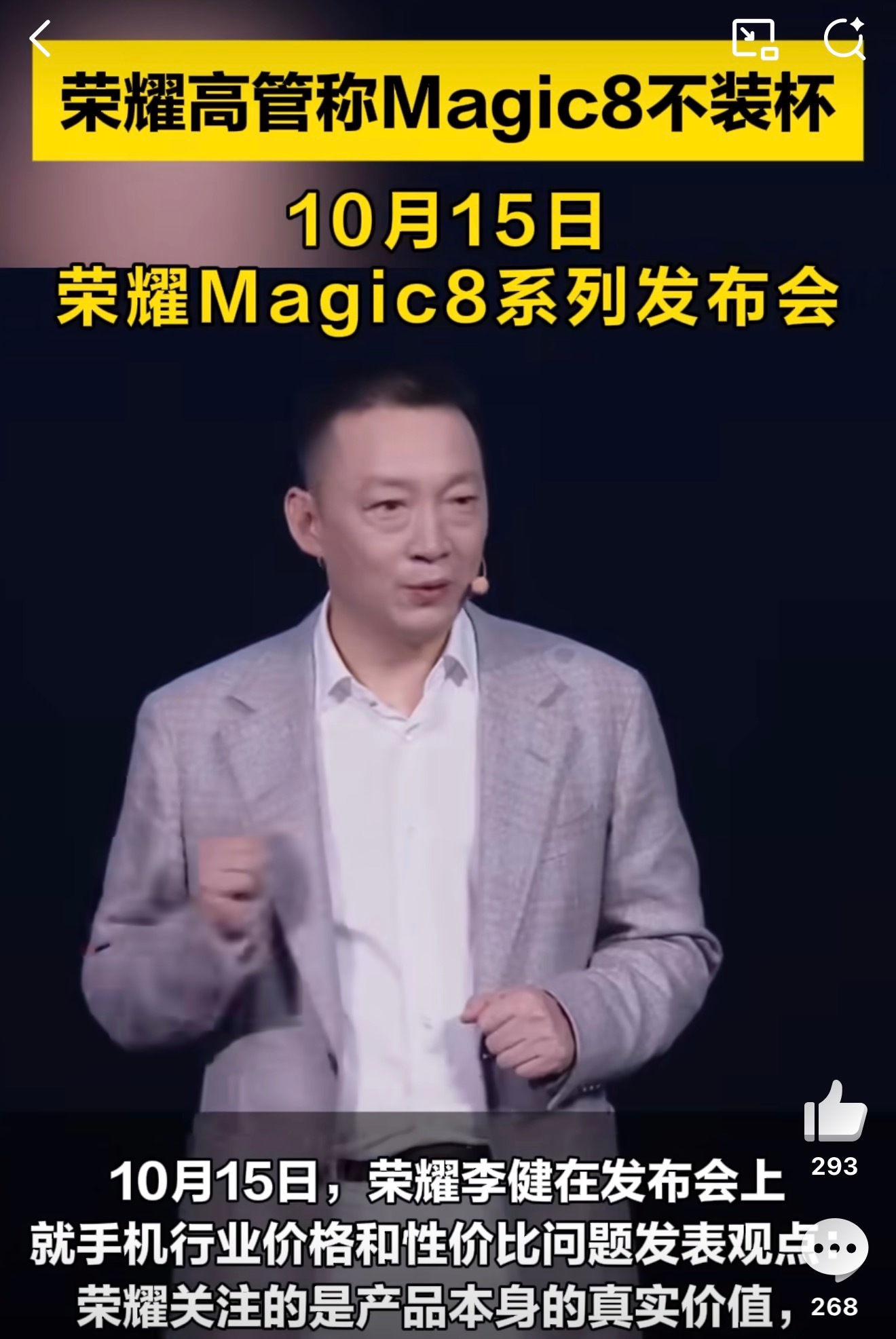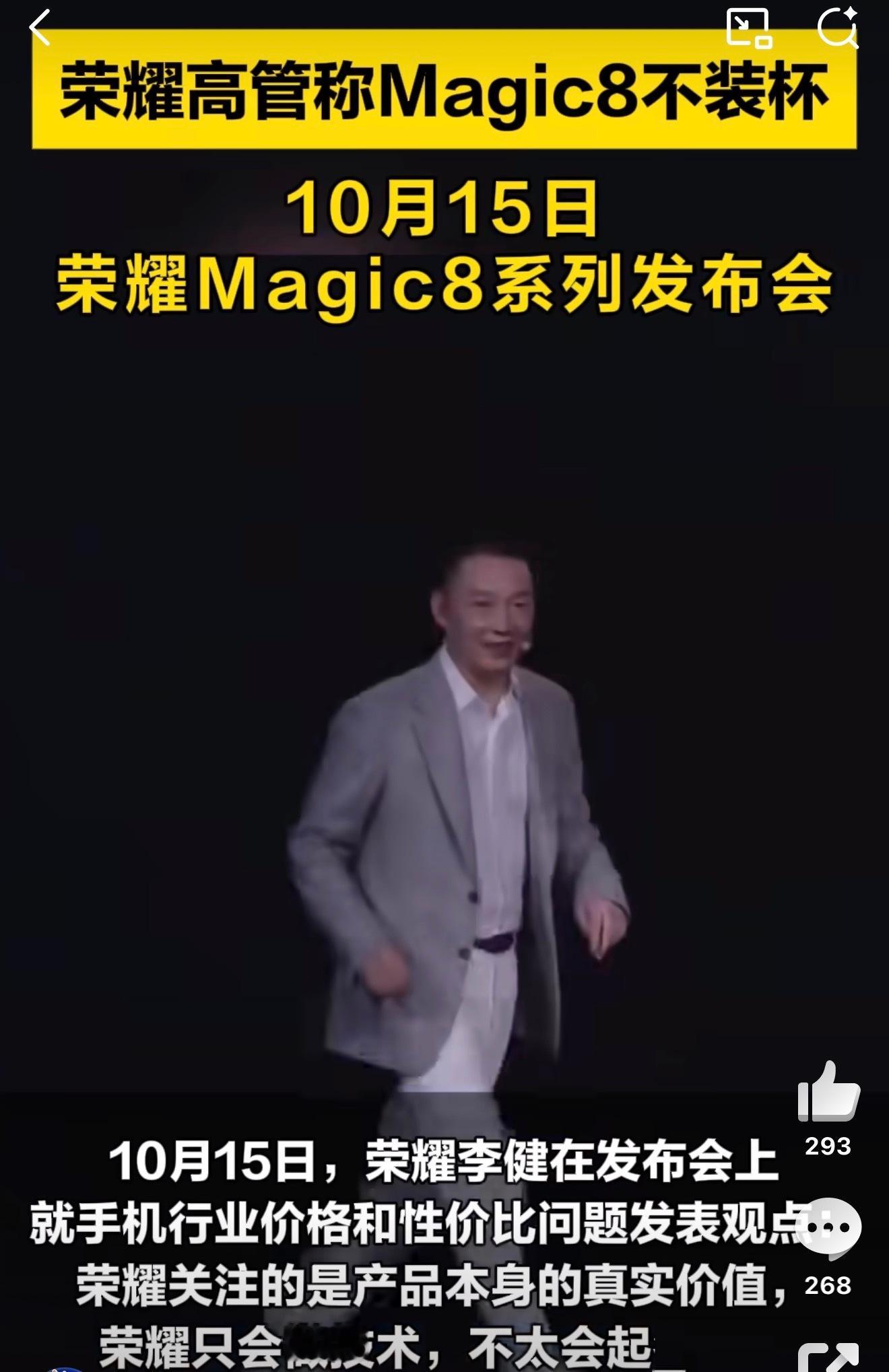 荣耀高管称Magic8不装杯荣耀还是那个实打实的“技术男”不会搞营销,只是一味的做产品,今年Magic8系列影像也跟上了,真正的没有短板的水桶旗舰。