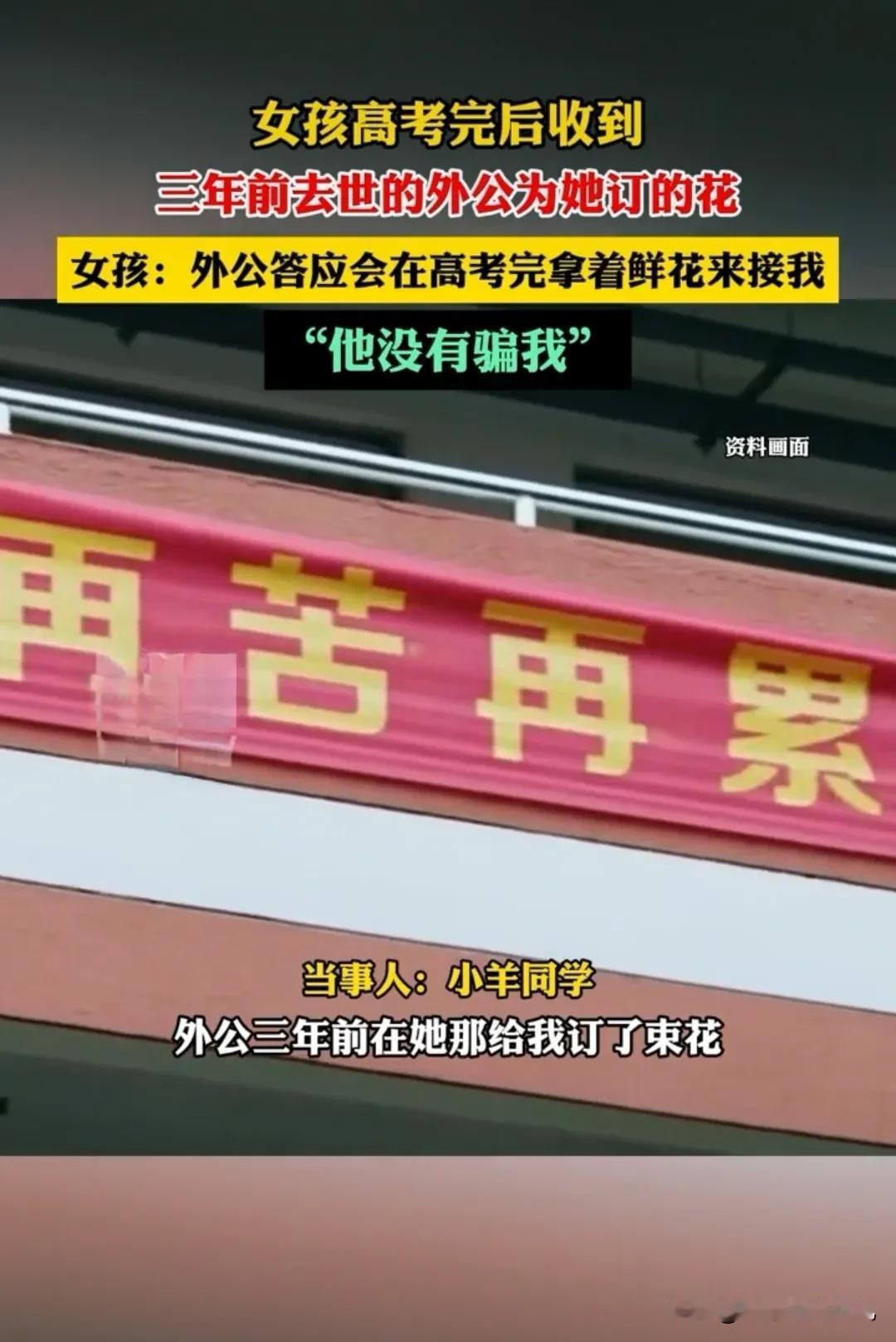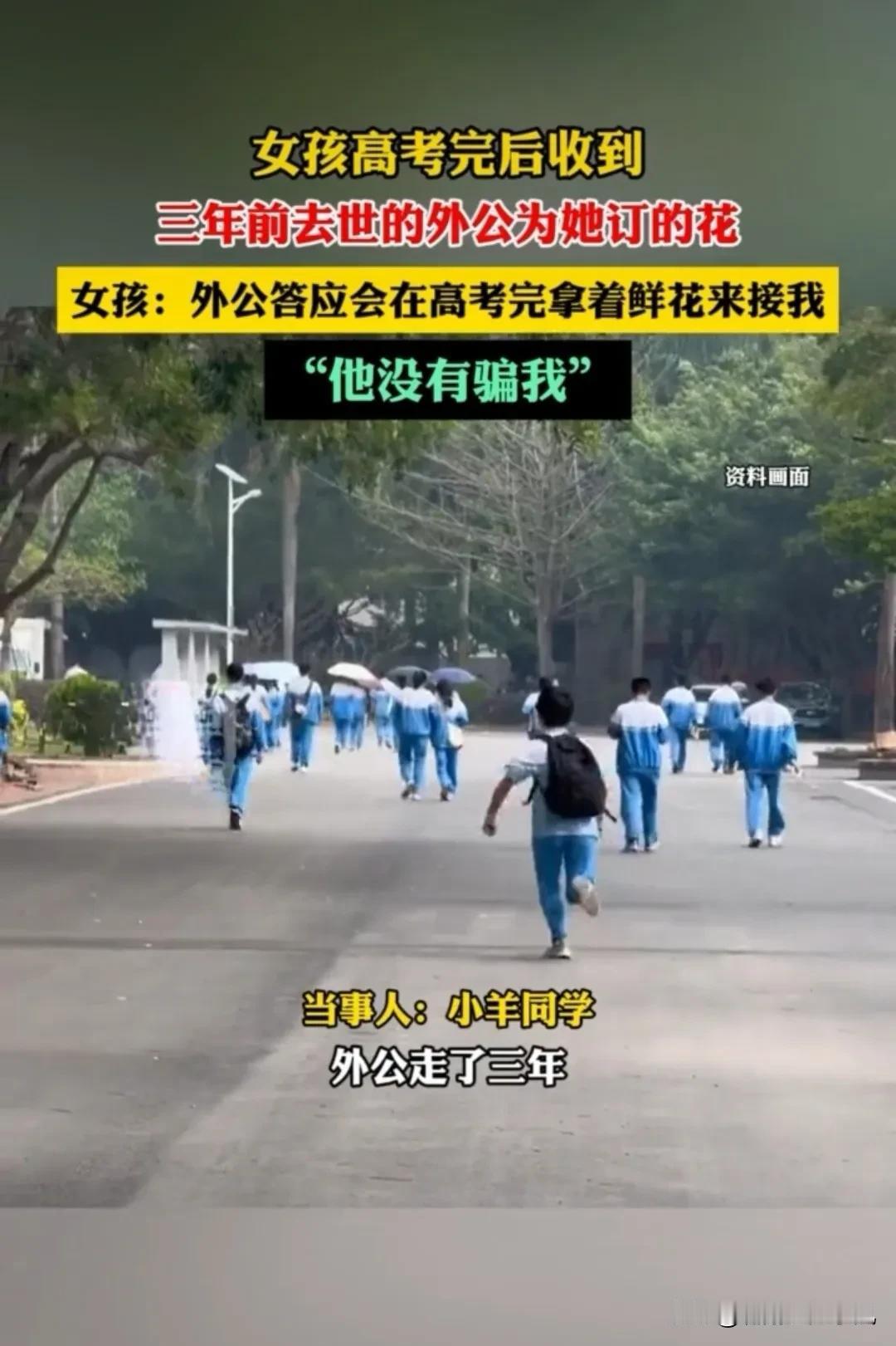 “看哭了,眼泪真的止不住!”高考结束后,女孩走出考场外,收到了三年前去世的外公为她定的花,女孩瞬间崩溃,哭的梨花带雨,“外公没有骗我,高考结束后他真的来接我了!”一句话令无数网友泪目!网友:眼睛尿尿了! 今年的高考结束了,但是考场外发生的故事却远远没有结束!原来还有这么多人为了这场“战斗”在默默奉献和付出着! 近日,一位刚结束高考的女孩发布了一条视频,引得很多网友成了陪哭团,女孩说,高考结束后,她收拾好东西,走出校门,上了妈妈来接她的车,看到后座上有一束很漂亮的花! 一开始,她以为是妈妈送的,便对妈妈说“谢谢妈妈,本来应该是我送你花的!” 没想到,妈妈的回答却让她瞬间崩溃,她妈妈说“这束花不是我订的,是你外公定的,我也是刚知道,他在三年前就定了这束花了”。 原来,女孩和外公有过约定,她跟外公说过,希望高考结束以后,自己走出校门口的时候,能看到外公捧着鲜花迎接她凯旋而归! 不幸的是,外公三年前突发重病,身体已经愈发消瘦,感觉时日无多的外公想起了孙女的约定,于是在去世前三天,去了楼下的花店,跟老板娘提前预定了三年后的一束花,还嘱咐花店老板娘一定要记住,这是他们的秘密! 三年后,花店老板娘一直没忘记这个约定,在高考前一个礼拜,她根据当时外公留下的联系方式,找到了女孩的妈妈,终于将这个秘密说了出来,花店老板娘说“当时老人已经很消瘦了,他觉得自己不行了,但是答应了孙女的事不能食言,所以才到她这里定了这束花!” 妈妈听后也是瞬间泪目,一想到自己的父亲去世前还如此牵挂自己的孩子,但她也是强忍着没告诉女孩,终于等到了高考结束,她们才将一切告诉女孩! 得知外公去世前还为自己做了如此浪漫的事情,女孩也是很感动,喃喃自语的说“小老头果然没骗我”! 这件事看哭了很多人,让人不禁想起了自己亲人,有网友说,孩子你要记住,这是外公教给你的最后一课,学会接受告别! 也有网友说外公一定是一个品行特别端正的人,在人生最后,还教会自己的孙女,什么叫承诺,那便是说到一定做到,不管以何种方式! 还有很多网友表示,看到这样的故事再也忍不住了,眼泪不停流,自己跟爷爷奶奶外公外婆也有很多约定,但是却没有机会在实现了! 【个人感受】 小编也是泪流满面! 人生也许会有很多遗憾,但爱是我们唯一能够感知的,超越了时空维度的东西,相信外公一定会看到女孩的成就。 生离死别固然可怕,但这不可避免的,有些人死了但却能一直活在别人的心里。 既然这样,活着的人带着离去的亲人们的期望,努力往前走吧! 因为他们都是天上的星星,一直陪伴着我们!