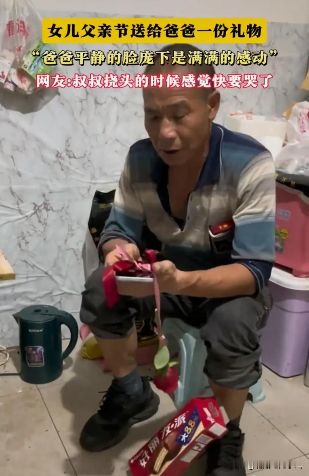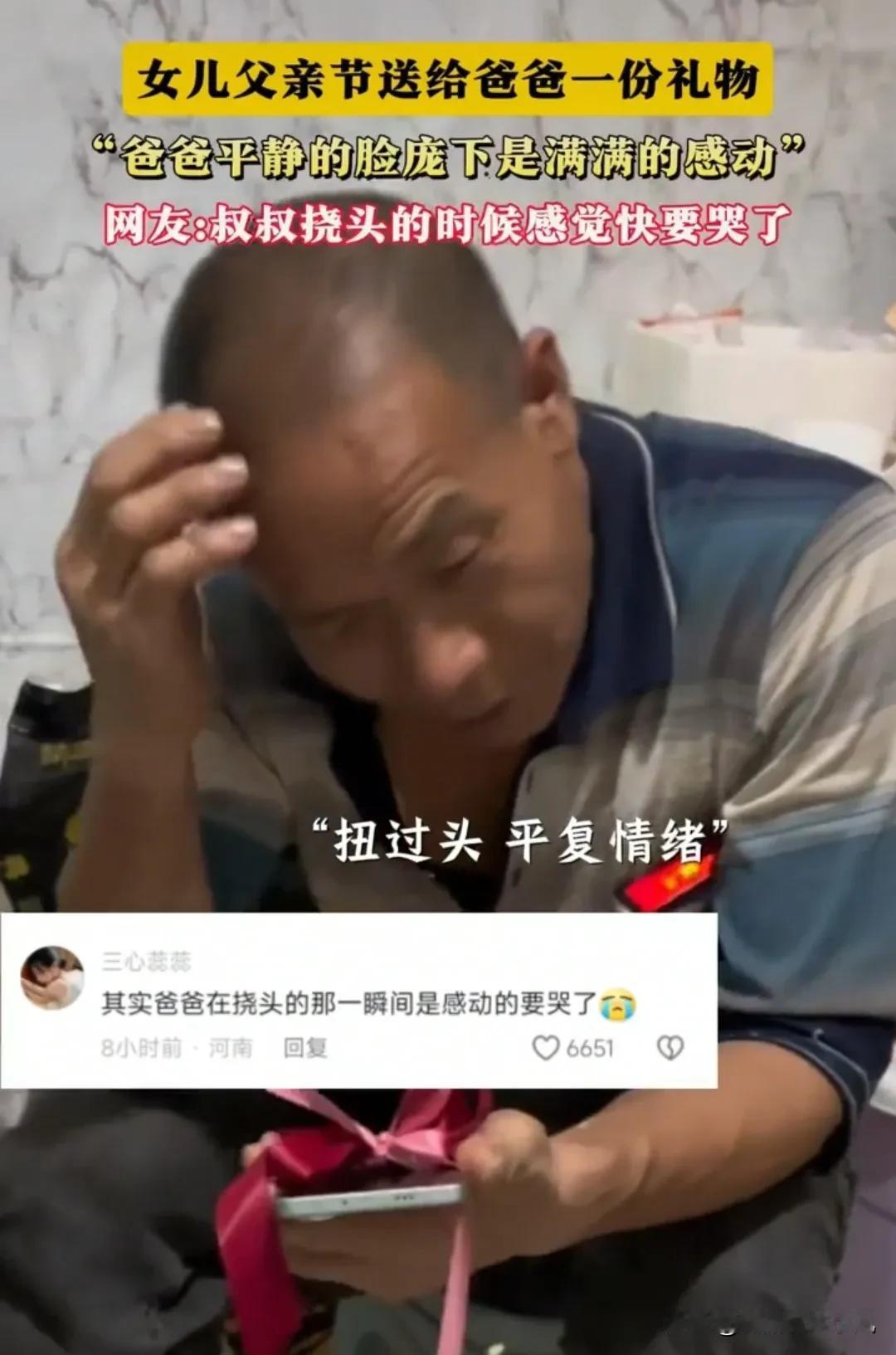 “看哭了!女儿送给父亲的礼物太暖了!”临近父亲节,浙江一女子用自己赚来的钱,给父亲送了一份节日礼物!一开始,父亲以为只是一盒饼干,当打开后,看到是自己心心念念喜欢的东西时,父亲绷不住了,网友们也跟着流泪了! 父亲节前一天,浙江一女子给自己的父亲准备了一份惊喜! 最近,她父亲的手机坏了,一直想买一台新手机,看了很久,终于挑到了一款喜欢的,但一看价格,父亲又舍不得了! 虽然是自己心爱的手机,但一想到要花这么多钱,老父亲想想还是不划算的,毕竟自己这个年纪已经不该追梦了! 哪怕心爱的手机是自己的“梦想”,在现实生活中,也应该排在柴米油盐酱醋茶之后! 女儿得知后觉得很心酸,父亲一辈子为自己和她们这个家庭付出这么多,当遇到喜欢的东西,还要为了家庭做出谦让! 于是,女儿用自己赚来的钱,背着父亲,买下了这台手机!然后她小心翼翼的将手机装饰好,甚至还细微的绑上小红绳!然后把手机装在一个饼干的盒子! 当天晚上,女儿看到父亲在客厅休息,就拿出一个饼干盒递给父亲说“爸爸你看里面有什么?” 父亲小心翼翼的接了过去,生怕摔了,边拆开盒子边问“什么东西呀?这么神秘!” 女儿只是笑而不语,父亲就伸手进盒子,当他拿出东西后,看到是自己心爱的手机,手机上还绑着一束玫瑰花,他有点不知所措! 他努力控制自己的情绪,生怕在自己女儿面前表现出来任何不妥,最后只能将头扭过一边,挠头的那一瞬间,感觉眼泪已经要出来了! 这件事引发了网友们的共鸣,有网友说,一个饼干盒,父亲都是轻拿轻放,反复确认有没有错漏东西,真的好心疼他,他确实是在努力生活吧! 也有网友说,父亲接过手机的那一瞬间,就像是第一次从医生手里接过女儿那样激动吧!平静的脸庞之下,尽是感动! 还有网友说,看完女儿的举动后,也是鼓励着自己,勇敢去爱,勇敢去表达吧,也许父母不善言语,但他们应该也很期待孩子在节日里给他们送礼物吧! [个人感受] 感恩是要发自内心的! 都知道中国人不擅长语言表达,比如对着父母说“我爱你”,有些人可能说不出口,父母也会觉得怪怪的! 但小编觉得这是老一辈的观念不同,如果我们换一种做法,多几次问候,多几次交流,多几个动作去表达爱意! 慢慢地,父母也是能够接受的!所以,勇敢去表达,尽快去爱吧!毕竟父母年纪大了,又还有多少时间等我们去改变! 最后祝所有人父亲节快乐! 我们愿用一切换你们岁月长流!
