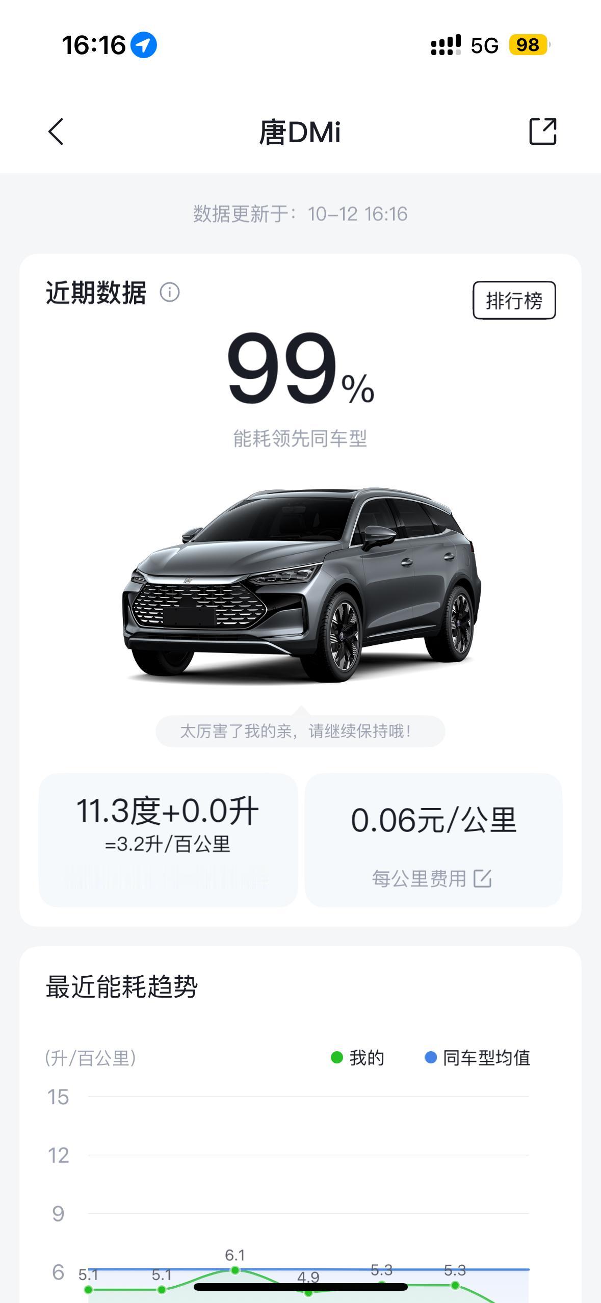 比亚迪这电耗控制真离谱 112公里21.5电池的混动唐昨天出去玩,平均时速50-60(限速),能耗11.3kw/h每百公里,最终用纯电跑了132公里,反向虚标,这还只是用到25的电,还能强制放到15,早上出发景区附近特来电补能充电桩损耗有点大,正常能充进去16.5度电,实际只充了14.5度,损耗两度!百分之37起充,如果不算损耗,这个速度用纯电实际能跑160公里以上,放在唐这种两吨多的车上,我只能说:牛比![奸笑]比亚迪唐 比亚迪