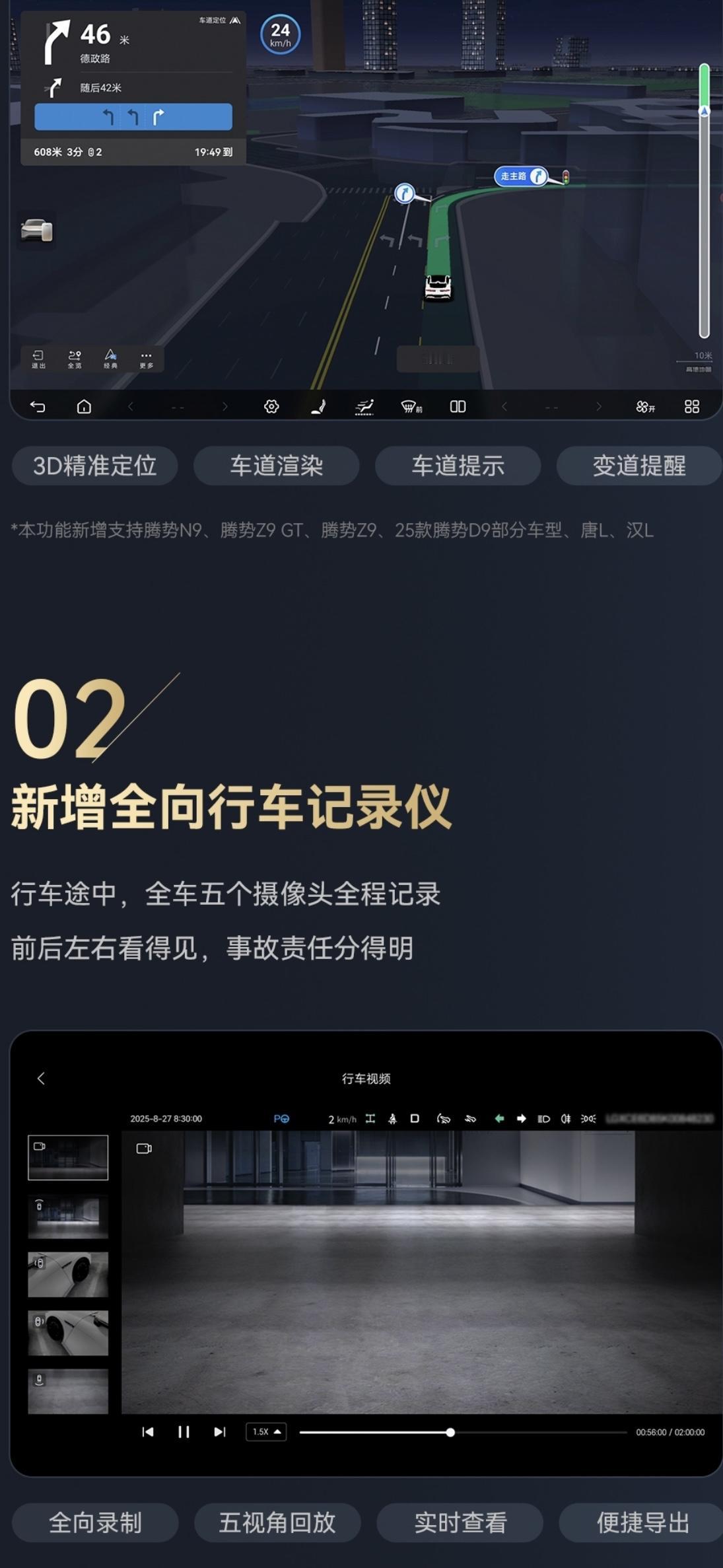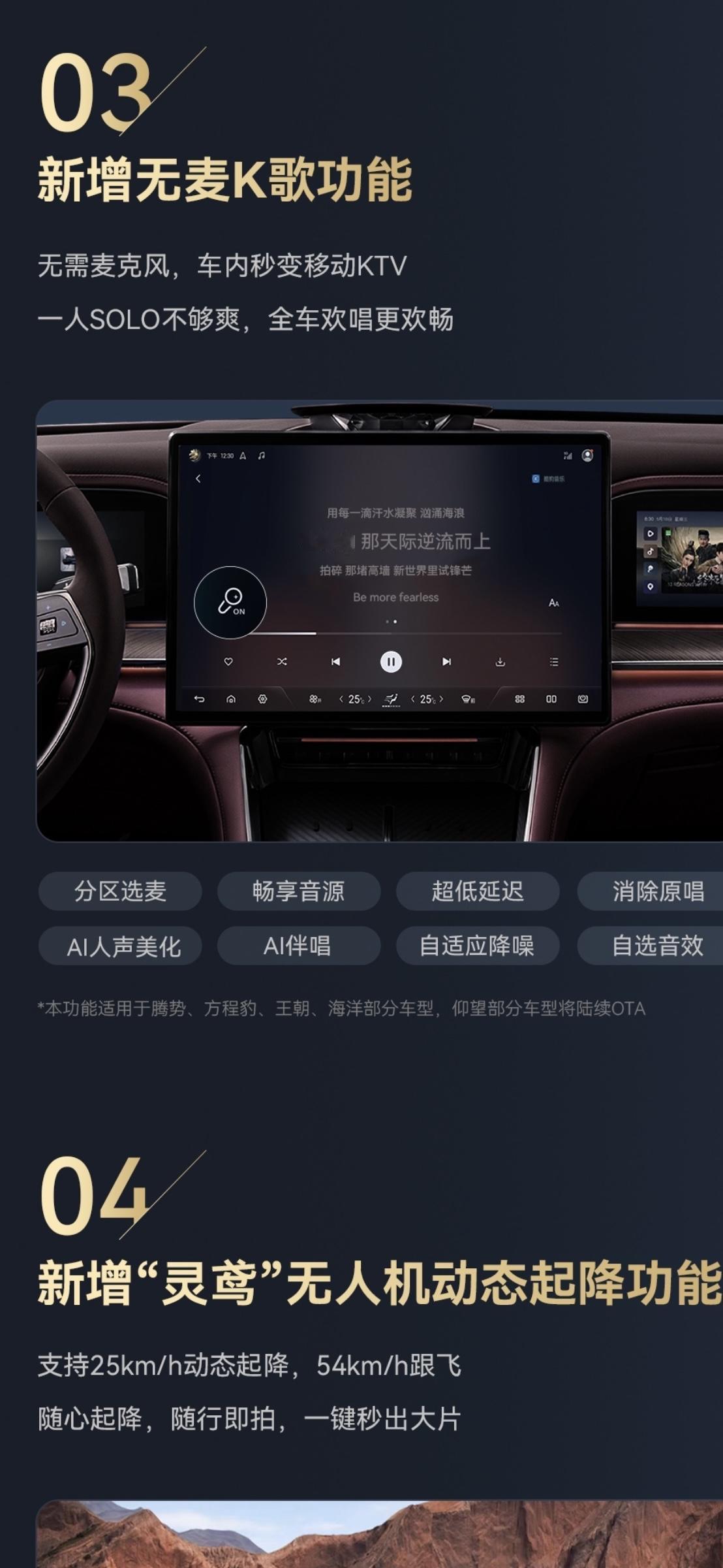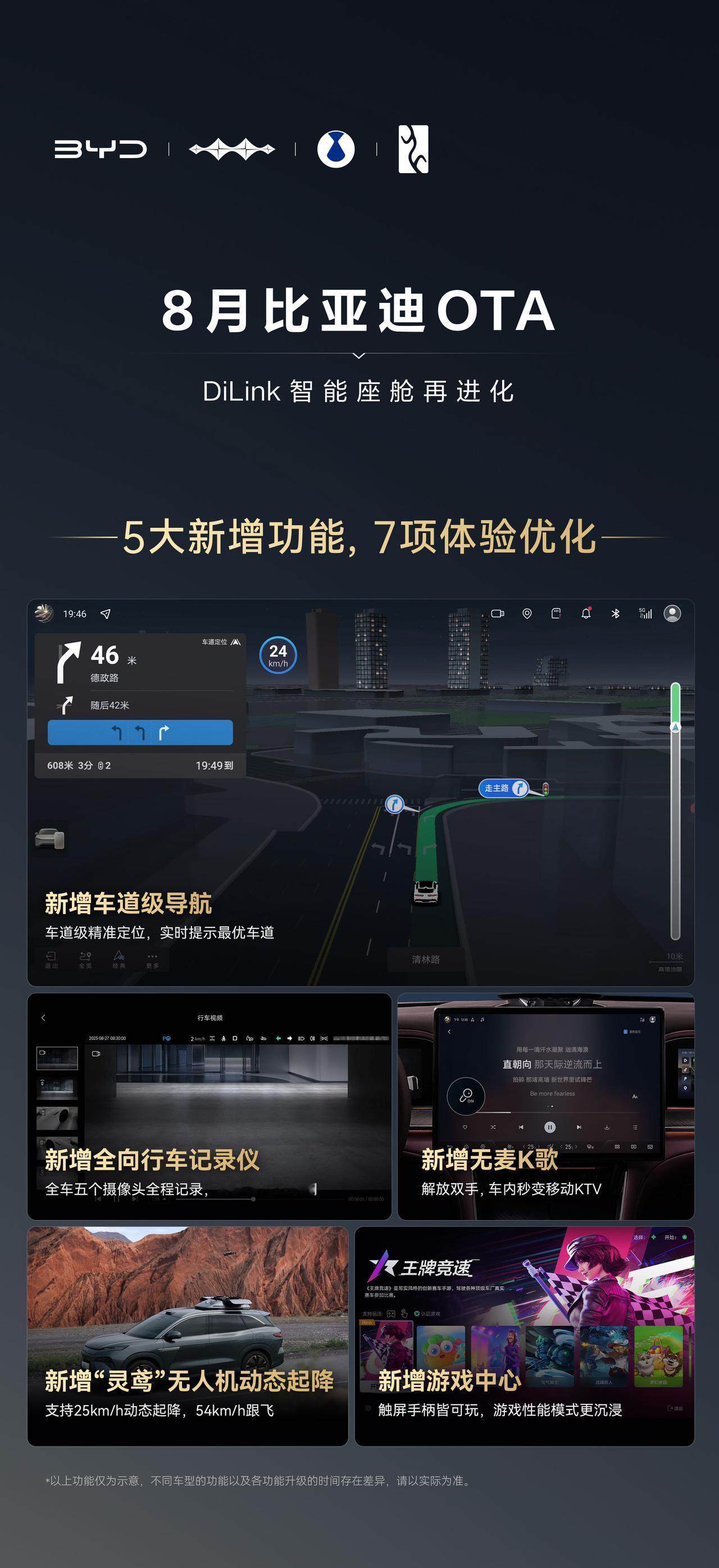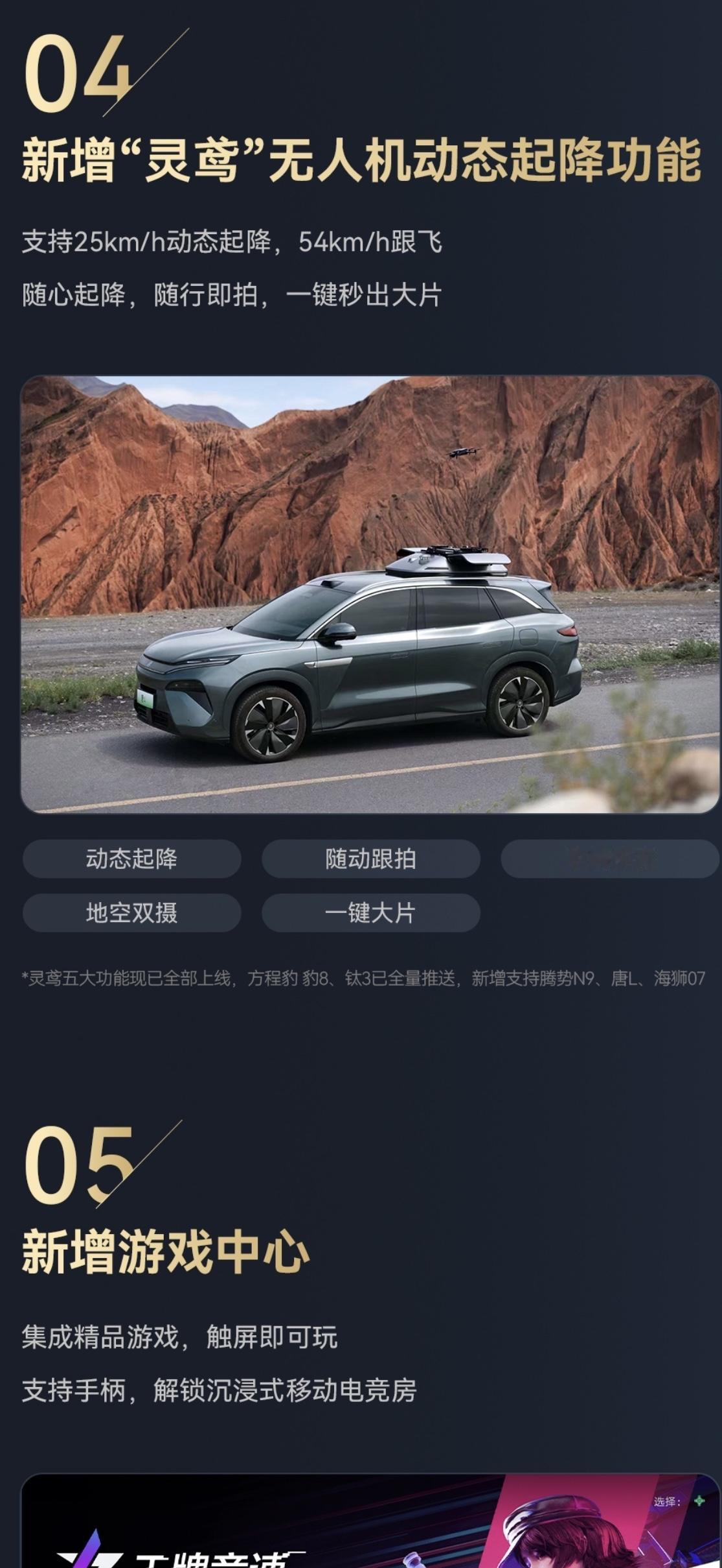 每月一次OTA,智驾版比亚迪车主你们就偷着乐吧[发怒] 24款的我只有羡慕的份,从今年智驾版推出,迪子的OTA进度终于跟上来了,只不过25款之前的车主们只有干瞪眼的份,好在陆陆续续也有不少24款,23款的车型升级了一些功能,像千里眼和哨兵模式都跟上主流了,这次27号的升级,包括车道级导航,全向行车记录仪,无麦K歌,无人机动态起降,游戏中心等等,更新的内容非常多,不过具体还是要根据车型和配置去更新,像无人机动态起降,如果你买的不是无人机顶配版本,自然就没有啦[尬笑]最让我这个老车主眼馋的还是车道级导航和全向行车记录仪,不过看更新名单里,只有新款汉唐L以及腾势方程豹车型有更新,智驾版的车型上包括在售的汉唐DMI都没有,期待迪子抓紧普及,全向行车记录仪针对碰瓷和一些交通事故绝对是判责的利器,如果后期能给硬件支持的老车主们也更新下再好不过了,吐槽下迪子的HUD,显示的信息太单调了,买回来一年基本都没怎么用过,能不能下次OTA也升级下[捂脸]比亚迪 比亚迪智驾功能