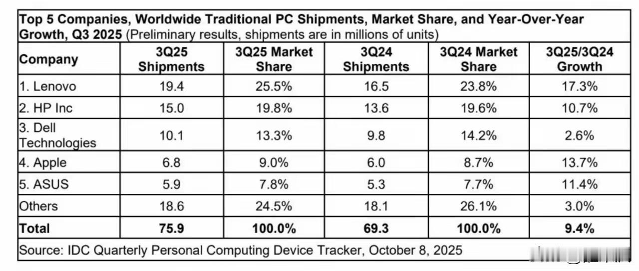 联想被骂了五年, 电脑业绩一样稳居第一, 2025年第三季度, 联想全球销售量份额25.5%, 惠普全球销售量份额是19.8%, 戴尔全球销售量份额13.3%, 华为未进前五!