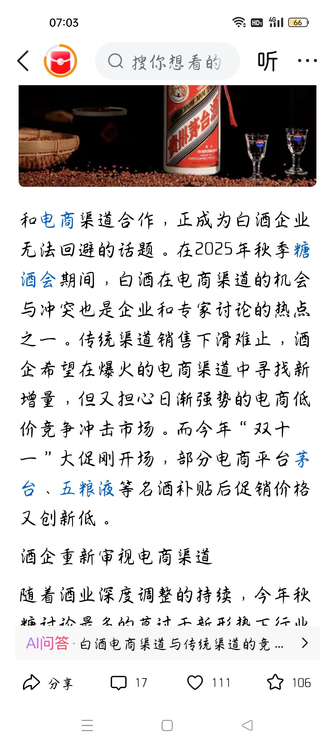 53度飞天茅台补贴价跌破1700元,我想说 据上观新闻报道,近期随着"双十一“大促启动,多个电商平台的名酒补贴后售价再现下滑趋势,部分平台53度飞天茅台补贴价跌破1700元,为什么会这样呢?个人认为,还是供大于求,之前茅台酒之所以高位,主要是由于需求大,现在需求说了,公务接待原则上不得上酒,而私人喝酒,谁舍得喝茅台酒呢?而且目前,许多人忙于生计,也没钱消费名酒。个人认为,名酒降价势在必行。而酒厂也要生产面临大众的酒,才有销量。我说得对吗?欢迎评论。